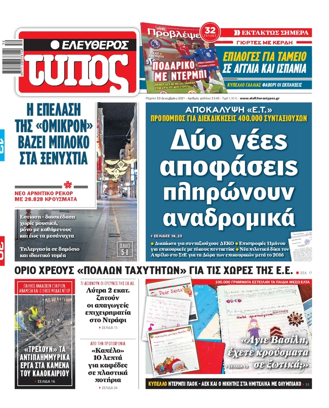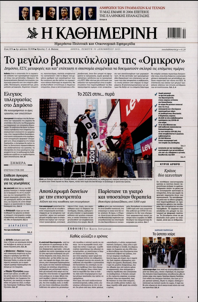 Τα πρωτοσέλιδα των ελληνικών εφημερίδων για σήμερα Πέμπτη 30 Δεκεμβρίου. Δείτε τι φιλοξενεί στην πρώτη του σελίδα ο πολιτικός και οικονομικός Τύπος και τα θέματα της επικαιρότητας που ξεχωρίζουν.