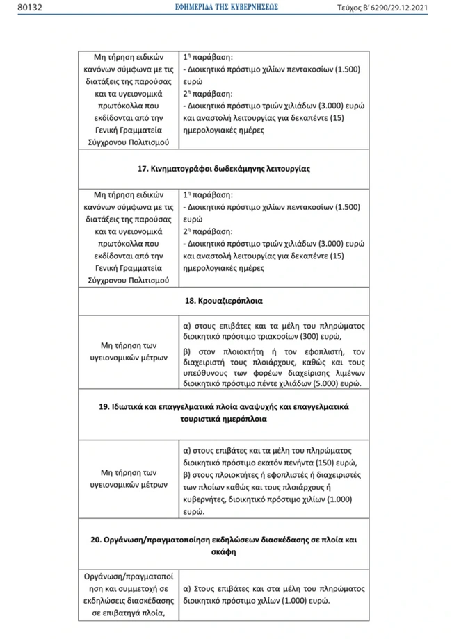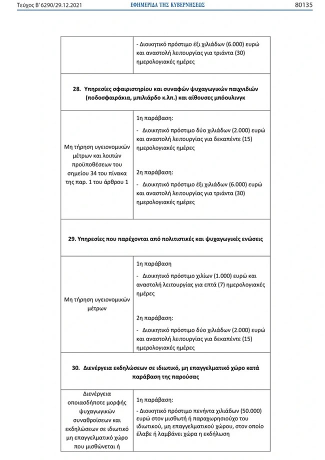 Ειδικότερα, στη ΚΥΑ επισημαίνεται ότι για τη «διενέργεια οποιασδήποτε μορφής ψυχαγωγικών συναθροίσεων και εκδηλώσεων σε ιδιωτικό μη επαγγελματικό χώρο που μισθώνεται ή παραχωρείται προς τον σκοπό αυτό, καθώς και διενέργεια οποιασδήποτε μορφής ψυχαγωγικών συναθροίσεων και εκδηλώσεων σε ιδιωτικό χώρο έναντι ανταλλάγματος ή εφόσον αυτές εμπεριέχουν τη μίσθωση εξοπλισμού ή υπηρεσιών μουσικής διασκέδασης» προβλέπεται διοικητικό πρόστιμο πενήντα χιλιάδων (50.000) ευρώ στον μισθωτή ή παραχωρησιούχο του ιδιωτικού, μη επαγγελματικού χώρου, στον οποίο έλαβε ή λαμβάνει χώρα η εκδήλωση. Το παραπάνω πρόστιμο αφορά την 1η παράβαση, ενώ για τη 2η παράβαση το πρόστιμο εκτοξεύεται στα 200.000 ευρώ στον μισθωτή ή παραχωρησιούχο του ιδιωτικού, μη επαγγελματικού χώρου, στον οποίο έλαβε ή λαμβάνει χώρα η εκδήλωση.