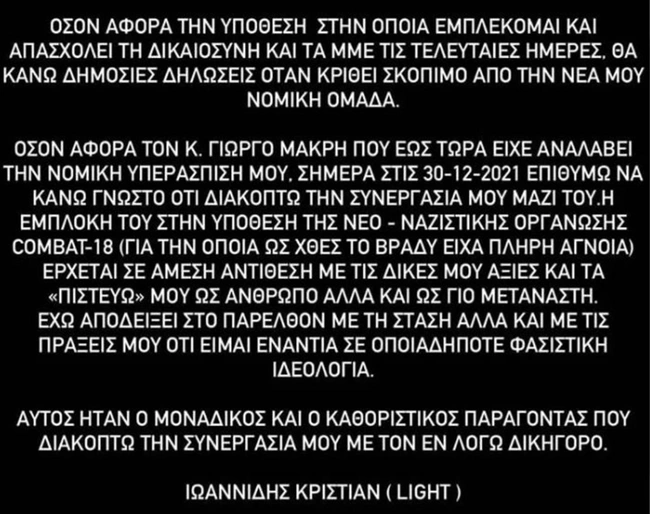 Συγκεκριμένα, ο Χρήστος Ιωαννίδης γνωστός ως Light, αποφάσισε να σταματήσει τη συνεργασία με τον δικηγόρο του, Γιώργο Μακρή, λόγω εμπλοκής του στην υπόθεση της νεο-ναζιστικής οργάνωσης COMBAT 18.