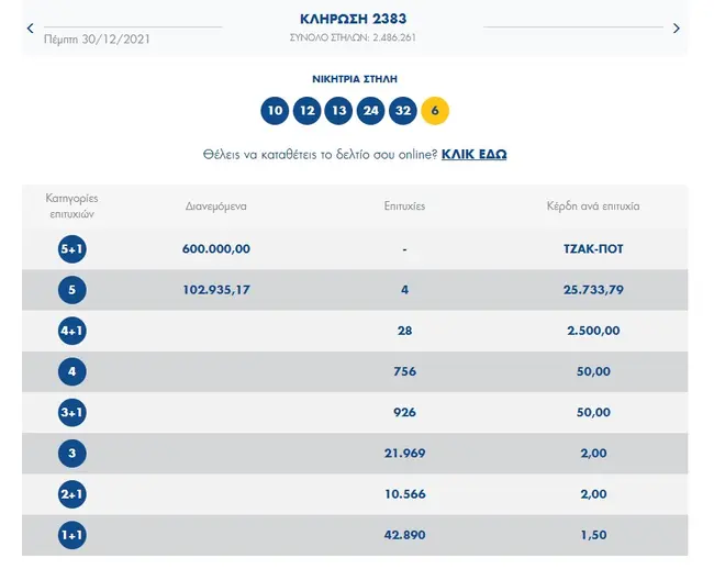 Σήμερα, Πέμπτη 30 Δεκεμβρίου 2021, στην κλήρωση 2383 Τζόκερ του ΟΠΑΠ, θα μοιραστούν στους τυχερούς της πρώτης κατηγορίας 600.000 ευρώ.