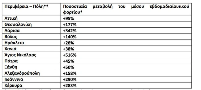 Θεσσαλονίκη: Την τελευταία εβδομάδα, 27/12/21-02/01/22, στη Θεσσαλονίκη, η εβδομαδιαία μέση τιμή του ιικού φορτίου των αστικών λυμάτων παρουσίασε οριακή αύξηση (+177%) σε σχέση με την προηγούμενη εβδομάδα, 20-26/12/21. Πρέπει να σημειωθεί ότι η αύξηση του ιικού φορτίου από τις 18/12/21 μέχρι τις 02/01/22 ήταν ραγδαία και κατά το διάστημα αυτό οι ημερήσιες μέσες τιμές αυξήθηκαν συνολικά κατά 370%.