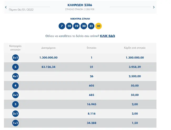 Σήμερα, Πέμπτη 6 Ιανουαρίου 2022, στην κλήρωση 2386 Τζόκερ του ΟΠΑΠ, μοιράζεται στους τυχερούς της πρώτης κατηγορίας το ποσό του 1.300.000 ευρώ