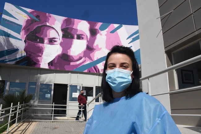 Το έργο καλύπτει τη μια πλευρά του νοσοκομείου επί των οδών Αφεντούλη και Ζαννή και είναι μια επιβλητική τοιχογραφία που δίνει τη δική της σημασία στους «Ηρωες» υγειονομικούς που εδώ και δύο χρόνια σηκώνουν βάρος της πανδημίας και στηρίζουν το ΕΣΥ.