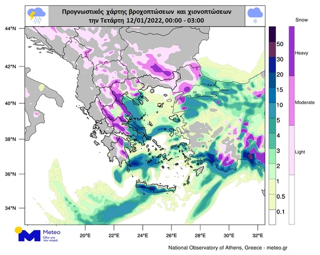 Στην Αττική και στην πόλη της Αθήνας, μετά το μεσημέρι αναμένονται βροχές και παροδικές καταιγίδες αλλά και χιόνια στα ορεινά, τα οποία από το βράδυ θα επεκταθούν σε περιοχές με χαμηλότερο υψόμετρο στα βορειοδυτικά και τη νύχτα στα βόρεια. Παρακάτω αποτυπώνεται η γεωγραφική κατανομή των βροχοπτώσεων (μπλε/πράσινες αποχρώσεις) και των χιονοπτώσεων (μωβ αποχρώσεις) τις πρώτες ώρες της Τετάρτης 12/01.