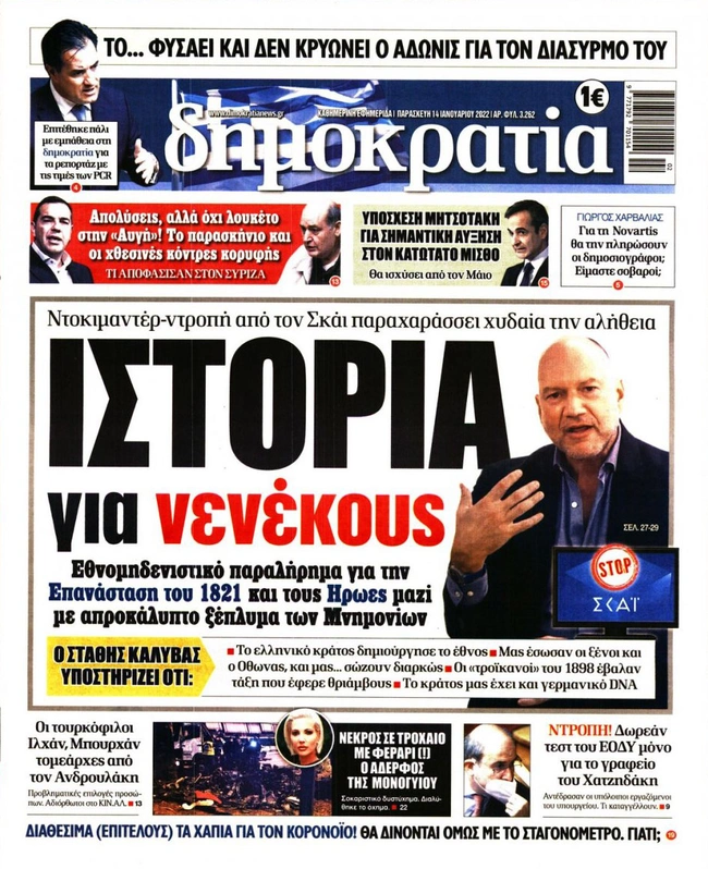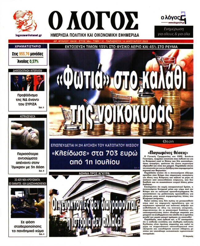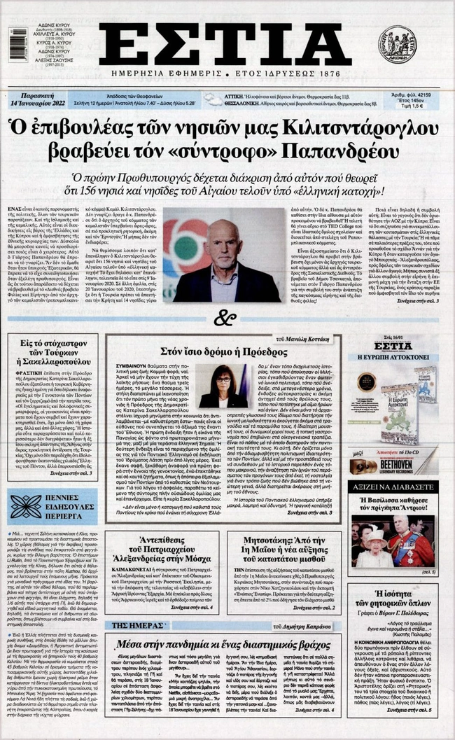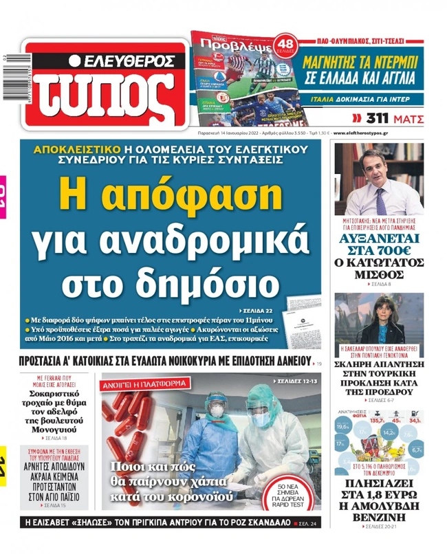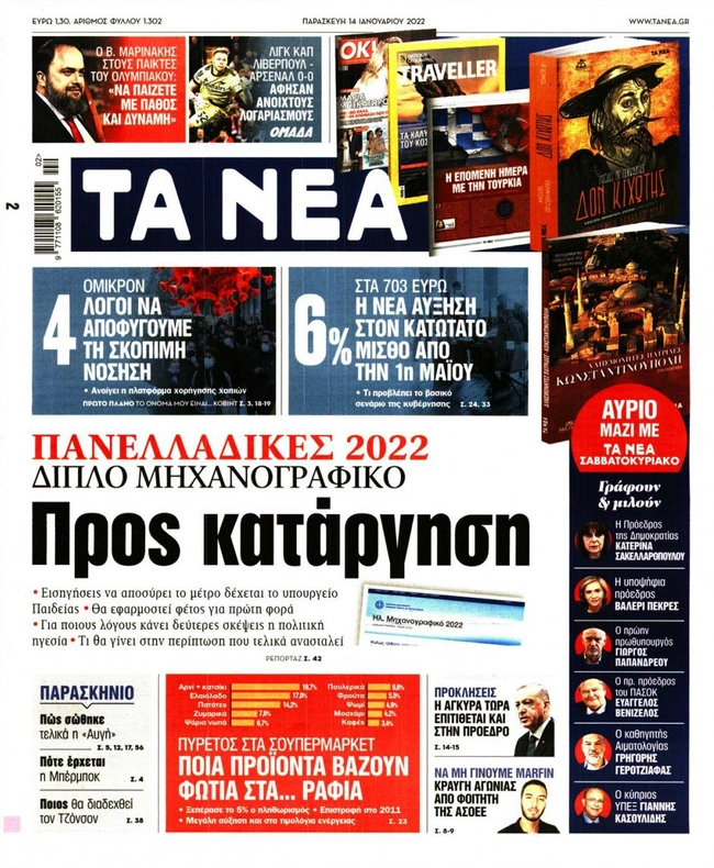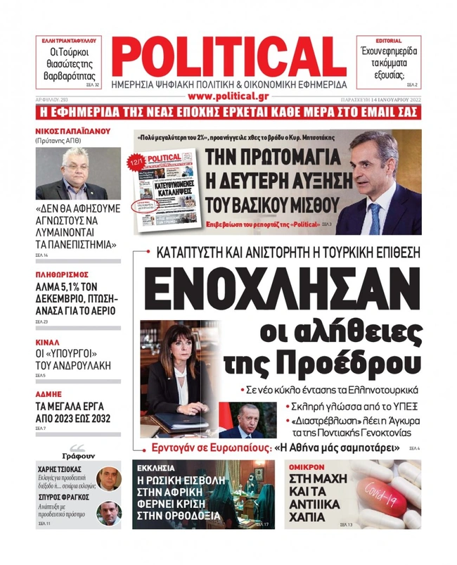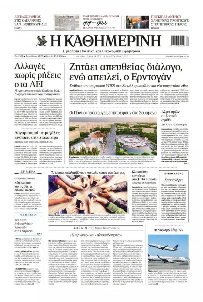 Τα πρωτοσέλιδα των ελληνικών εφημερίδων για σήμερα Παρασκευή 14 Ιανουαρίου. Δείτε τι φιλοξενεί στην πρώτη του σελίδα ο πολιτικός και οικονομικός Τύπος και τα θέματα της επικαιρότητας που ξεχωρίζουν.