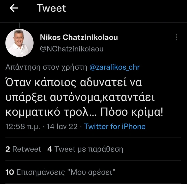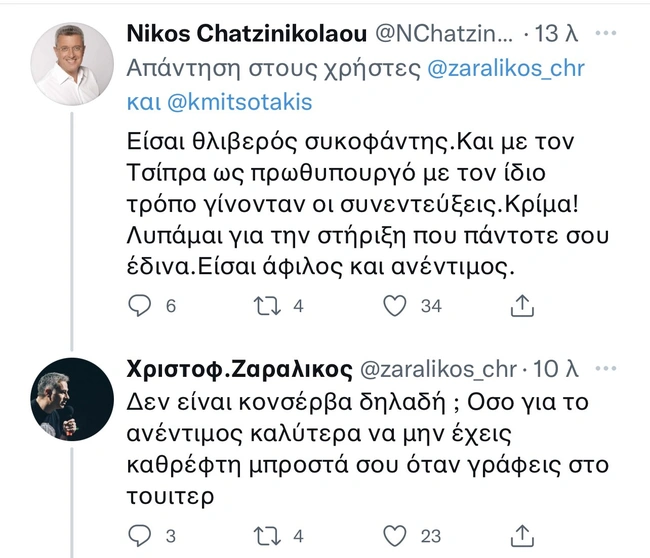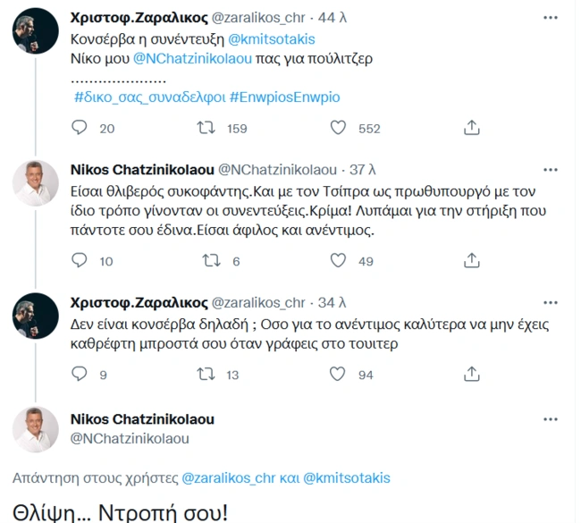 Ο Χριστόφορος Ζαραλίκος, παρακολουθώντας την συνέντευξη του Κυριάκου Μητσοτάκη στο Ενώπιος Ενωπίω και τον Νίκο Χατζηνικολάου, προφανώς είχε κάποιες ενστάσεις για τον τρόπο που προσέγγισε ο δημοσιογράφος τον πρωθυπουργό και του έκανε διάφορα καυστικά σχόλια στο Twitter. Ο Χατζηνικολάου του απάντησε κι άρχισαν να... αλληλοσπαράσσονται με εκατέρωθεν αναρτήσεις, που περιείχαν και χαρακτηρισμούς που ξέφευγαν από τα κόσμια πλαίσια...