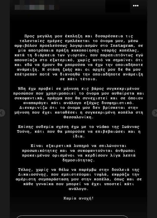 «Προς μεγάλη μου έκπληξη και δυσαρέσκεια πληροφορήθηκα ότι εμπλέκεται το όνομα μου, μέσω αμφιβόλου προελεύσεως λογαριασμών στο Instagram, σε μία αποτρόπαια πράξη κακοποίησης νεαρής κοπέλας κατά τη διάρκεια των γιορτών, που παρεπιπτόντως εγώ απουσίαζα στο εξωτερικό, χωρίς αυτό να σημαίνει ότι και εδώ να ήμουν θα μπορούσα να έχω την οποιαδήποτε ανάμειξη. Η στάση ζωής και οι αρχές μου δεν θα μου επέτρεπαν ποτέ να διανοηθώ κάτι τέτοιο στη ζωή μου. Ήδη έχω προβεί σε μήνυση εις βάρος συγκεκριμένου προσώπου που χρησιμοποιεί το όνομα μου, αυθαίρετα και συκοφαντικά, πράγμα που θα συνεχιστεί που θα συνεχιστεί και με όποιον αναπαράγει κάτι ανάλογο εξόχως δυσφημιστικό.