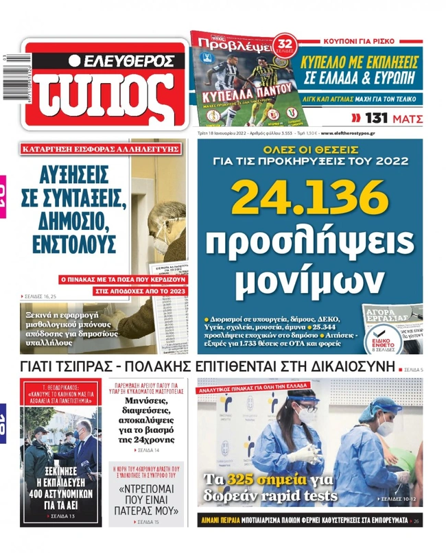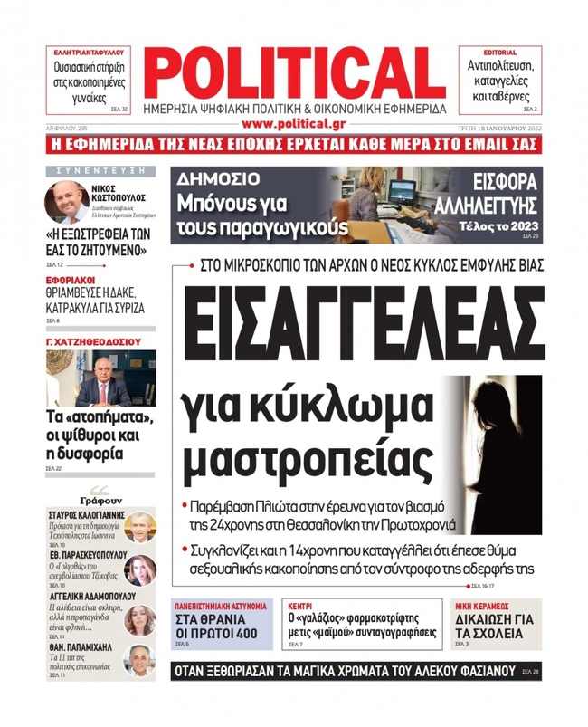 Τα πρωτοσέλιδα των ελληνικών εφημερίδων για σήμερα Τρίτη 18Ιανουαρίου. Δείτε τι φιλοξενεί στην πρώτη του σελίδα ο πολιτικός και οικονομικός Τύπος και τα θέματα της επικαιρότητας που ξεχωρίζουν.