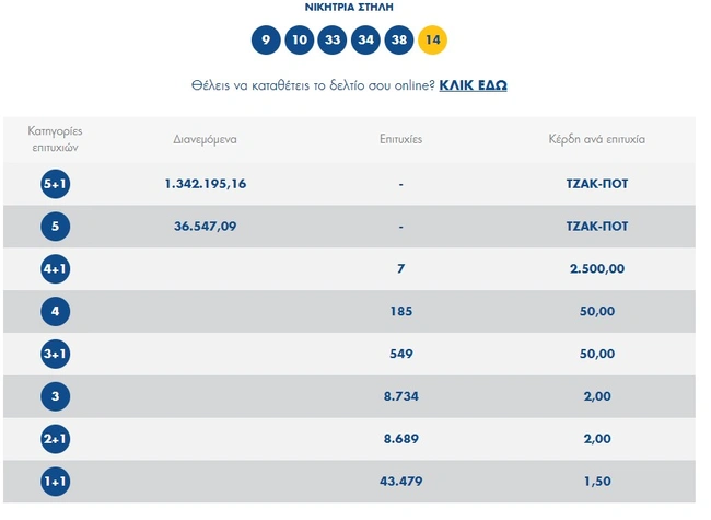 Οι τυχεροί αριθμοί στη σημερινή κλήρωση Τζόκερ είναι οι εξής: 38, 33, 10, 9, 34 και Τζόκερ ο αριθμός 14.