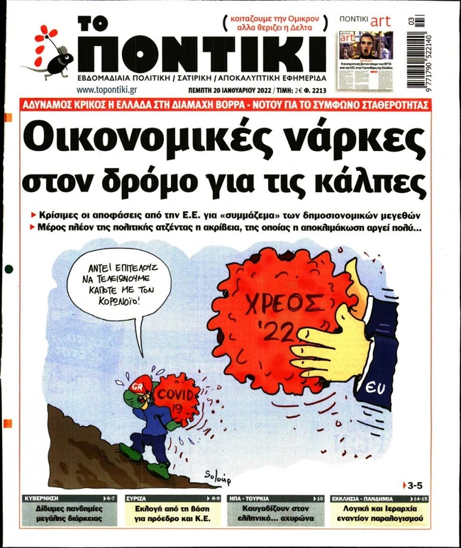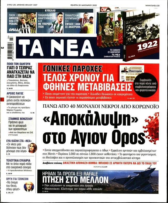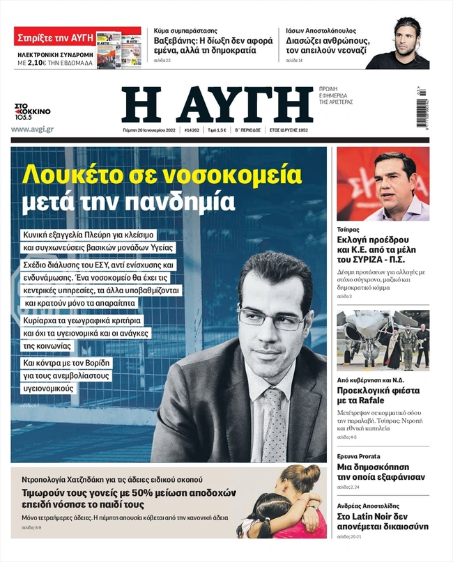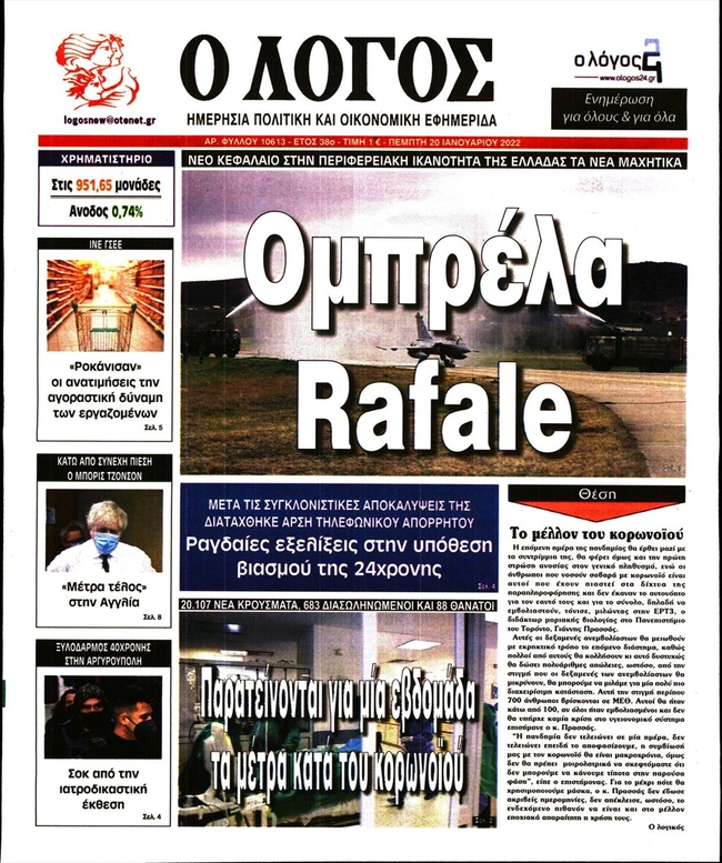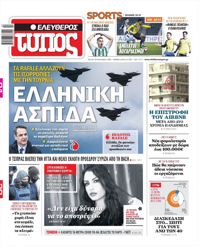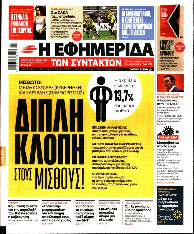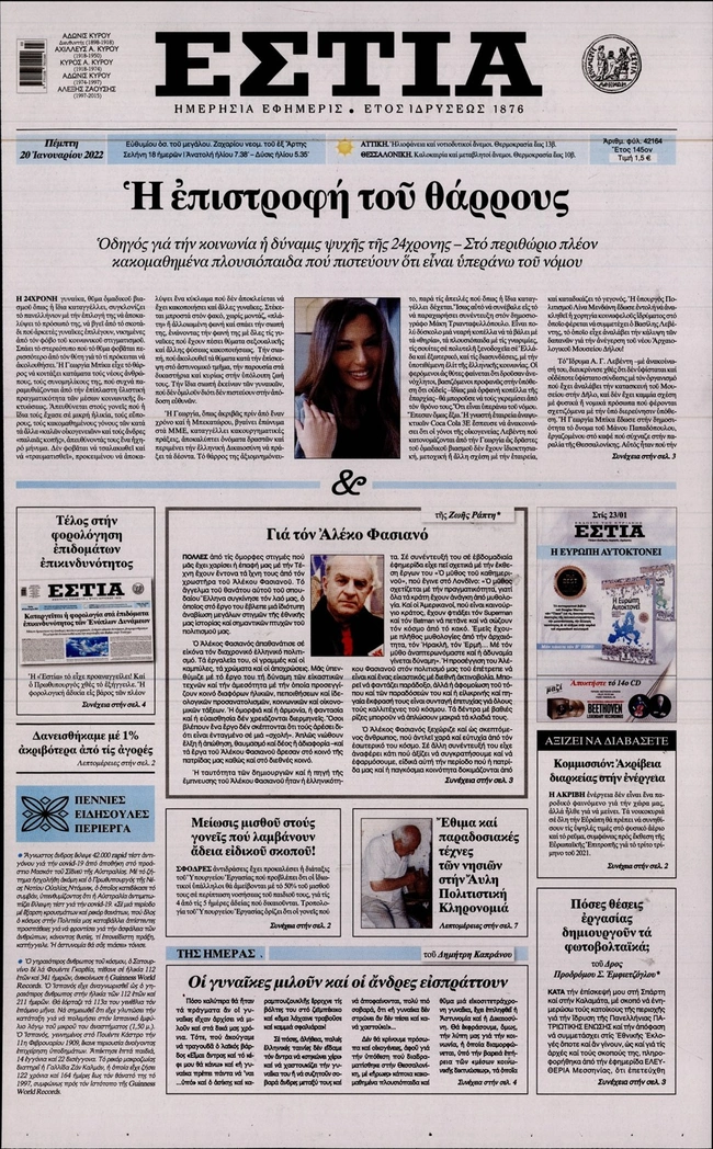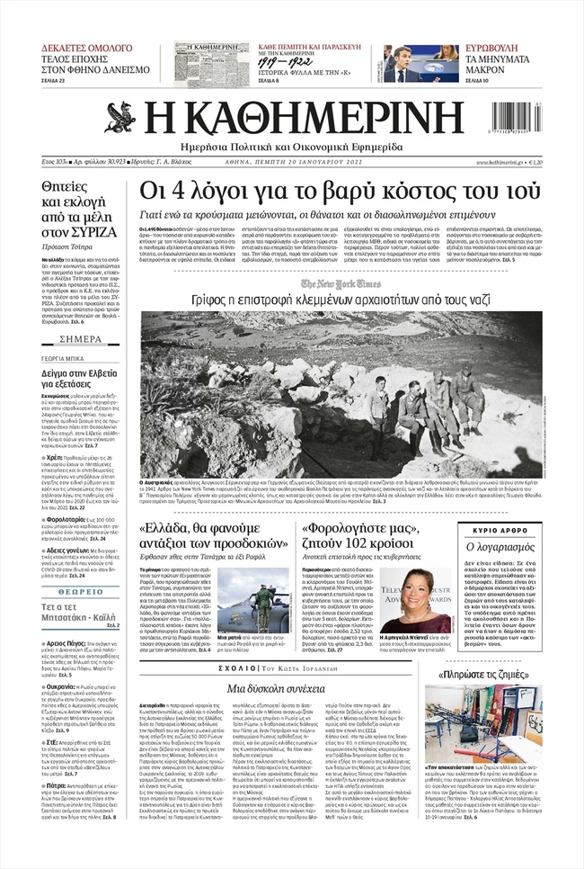 Τα πρωτοσέλιδα των ελληνικών εφημερίδων για σήμερα Πέμπτη 20 Ιανουαρίου. Δείτε τι φιλοξενεί στην πρώτη του σελίδα ο πολιτικός και οικονομικός Τύπος και τα θέματα της επικαιρότητας που ξεχωρίζουν.