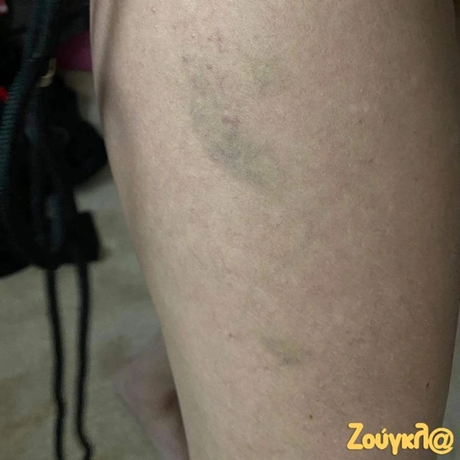 Σε φωτογραφίες που δημοσιεύει το zougla.gr είναι εμφανείς οι μώλωπες, που η ίδια ανέφερε ότι είχε στα πόδια της, σε συνέντευξή της για τα όσα καταγγέλλει πως συνέβησαν εκείνο το βράδυ στη Θεσσαλονίκη. Τρεις ημέρες αργότερα πήγε στον ιατροδικαστή και οι τοξικολογικές εξετάσεις έγιναν την ίδια ημέρα, ενώ τα αποτέλεσμά τους αναμένονται μέσα στις επόμενες δύο εβδομάδες.