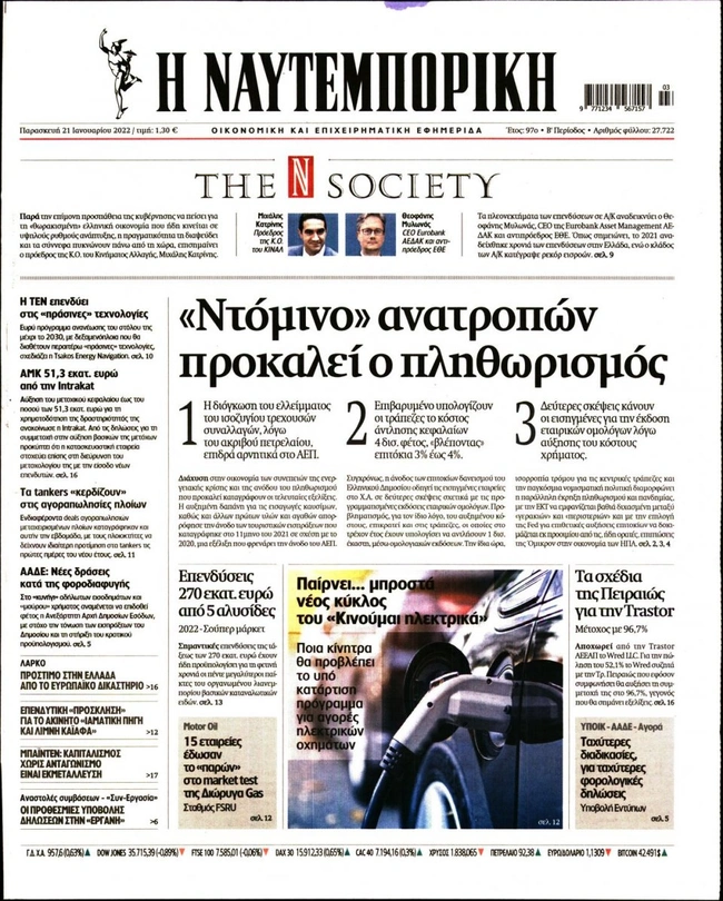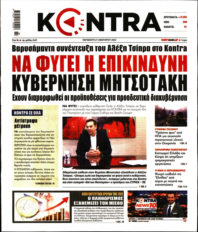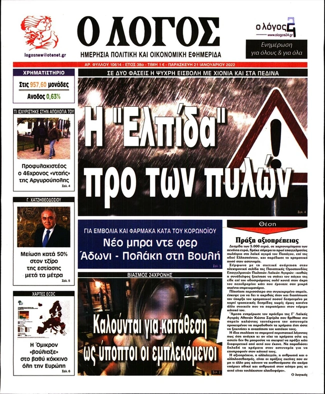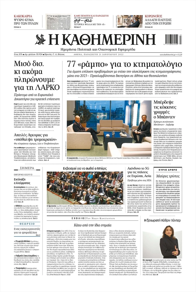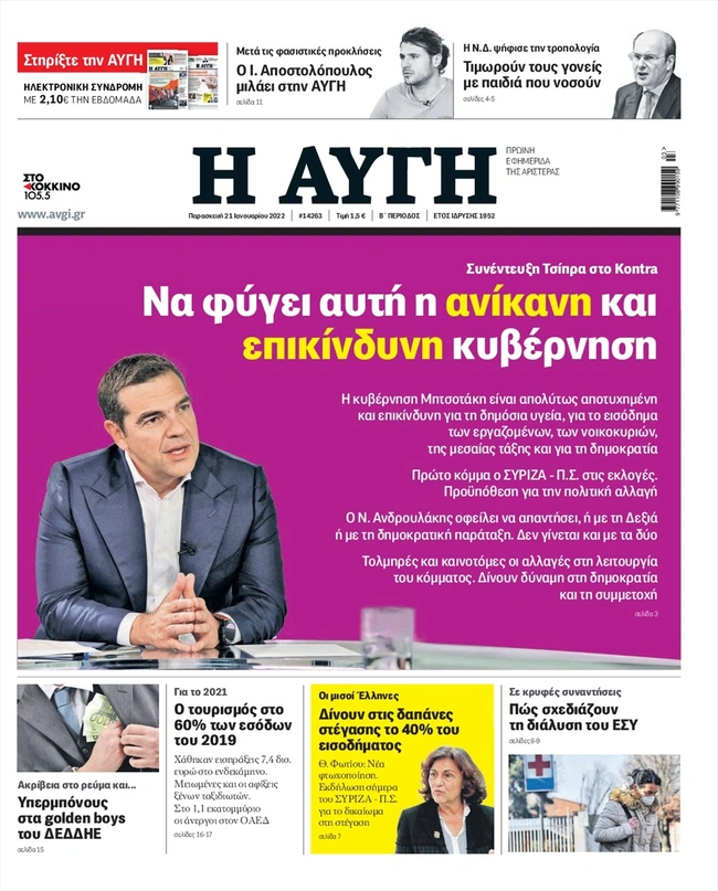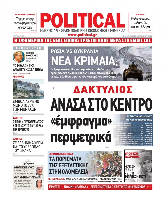 Τα πρωτοσέλιδα των ελληνικών εφημερίδων για σήμερα Παρασκευή 21 Ιανουαρίου. Δείτε τι φιλοξενεί στην πρώτη του σελίδα ο πολιτικός και οικονομικός Τύπος και τα θέματα της επικαιρότητας που ξεχωρίζουν.