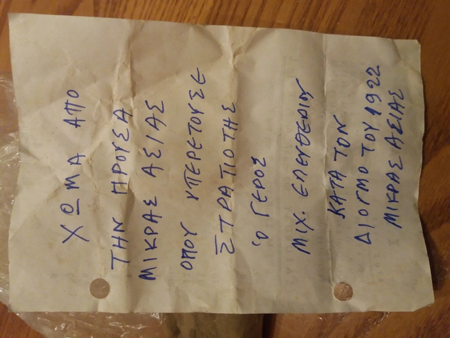 Το σημείωμα μοιάζει να είναι γραμμένο πιο πρόσφατα, «σημάδι ότι κάποιος που γνώριζε τι ακριβώς είναι αυτό, ήθελε να μας το γνωρίσει για να ξέρουμε όταν θα το βρούμε, τι ακριβώς είναι» είπε ο κ. Κόκκινος που όσο επιχειρεί να φροντίσει και να αποθηκεύσει πράγματα της μητέρας του, είναι σίγουρος ότι θα εντοπίσει και άλλα κειμήλια. «Ένιωσα και νιώθω ότι κάνω βουτιά στην ιστορία και πως με κάποιο τρόπο συνδέομαι με τους γονείς, τη γιαγιά και τον παππού μου, που θυμάμαι από μικρό παιδί να μας λένε ιστορίες για την πατρίδα στην οποία γεννήθηκαν. Πέρα από τη συγκίνηση, νιώθω και υπερηφάνεια για τους ανθρώπους αυτούς που μέσα από τον όλεθρο και τον δρόμο της προσφυγιάς, κατάφεραν και πάλι να σταθούν στα πόδια τους και να δημιουργήσουν» πρόσθεσε ο κ. Κόκκινος. Πάντως στην περιοχή της Νέας Αλικαρνασσού, σε πολλές από τις οικίες που έχουν αναφορά στο προσφυγικό στοιχείο, υπάρχουν κειμήλια που δεν έχουν αναδειχθεί.