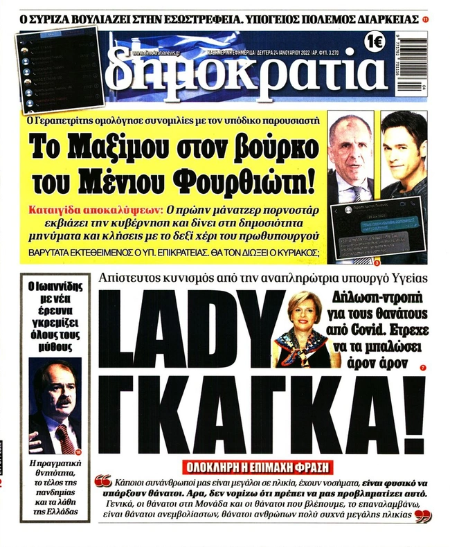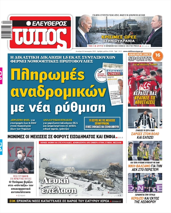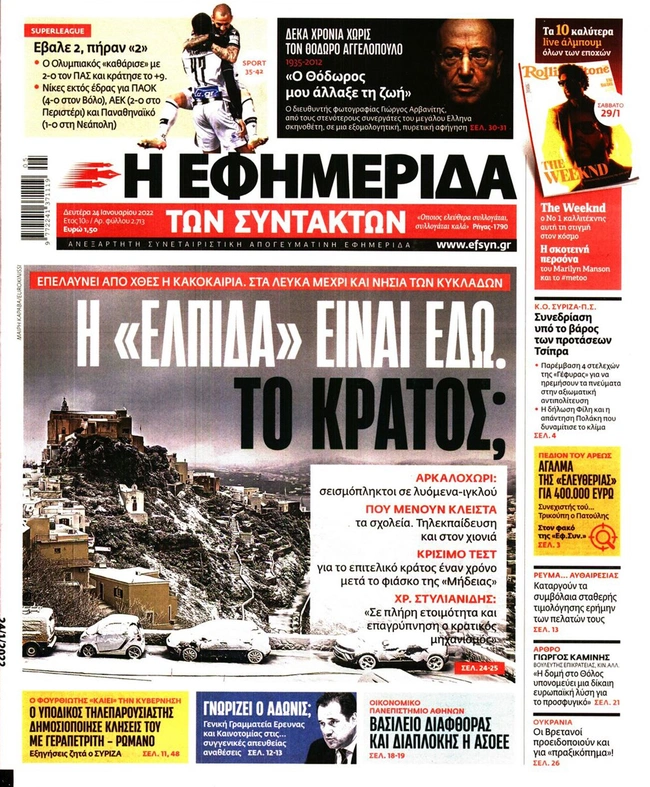 Τα πρωτοσέλιδα των ελληνικών εφημερίδων για σήμερα Δευτέρα 24 Ιανουαρίου. Δείτε τι φιλοξενεί στην πρώτη του σελίδα ο πολιτικός και οικονομικός Τύπος και τα θέματα της επικαιρότητας που ξεχωρίζουν.