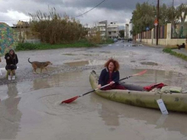 Συγκεκριμένα, η κυρία Κατερίνα Φραγκιαδάκη μένει στην οδό Ανδρέα Εμπειρίκου στο Ηράκλειο και στις φωτογραφίες της απεικονίζονται δρόμοι της περιοχής που έχουν μετατραπεί σε συγκρότημα από μικρές... λίμνες λόγω της κακοκαιρίας. Ετσι, η ίδια επιστράτευσε μέχρι και κανό για να διασχίσει τον δρόμο.
