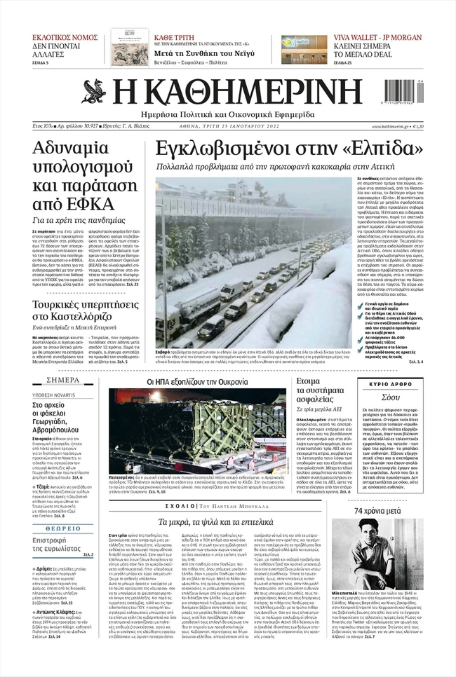 Τα πρωτοσέλιδα των ελληνικών εφημερίδων για σήμερα Τρίτη 25 Ιανουαρίου. Δείτε τι φιλοξενεί στην πρώτη του σελίδα ο πολιτικός και οικονομικός Τύπος και τα θέματα της επικαιρότητας που ξεχωρίζουν.