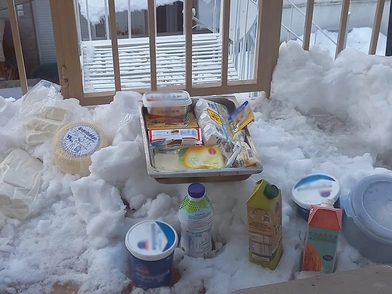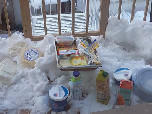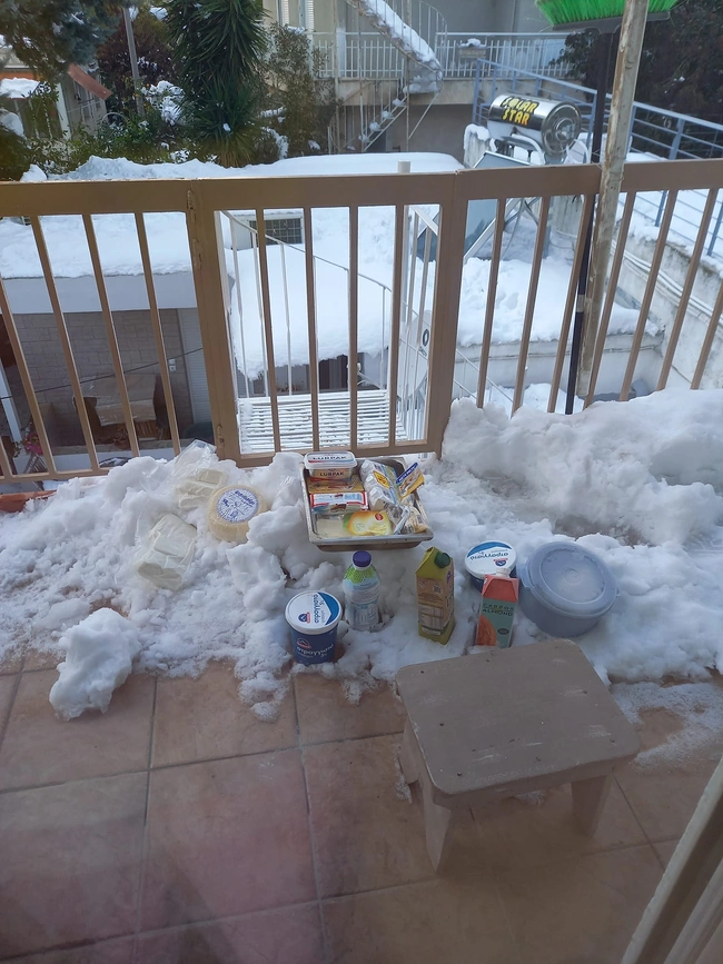 Είναι άλλωστε χαρακτηριστικές οι εικόνες που δημοσιεύουν κάτοικοι, που έχουν βγάλει τα τρόφιμά τους στο χιόνι για να διατηρηθούν καθώς οι ηλεκτρικές συσκευές δεν λειτουργούν. Και βέβαια τα περισσότερα σπίτια δεν έχουν ούτε θέρμανση καθώς αν κάποιος δεν διαθέτει ξυλόσομπα η τζάκι, δεν μπορεί να ζεσταθεί. Η συγκεκριμένη φωτογραφία είναι από τη σελίδα στο FB "Κάτοικοι Κάτω Χαλανδρίου", και ανάμεσά του βρίσκεται και παιδικό γάλα.