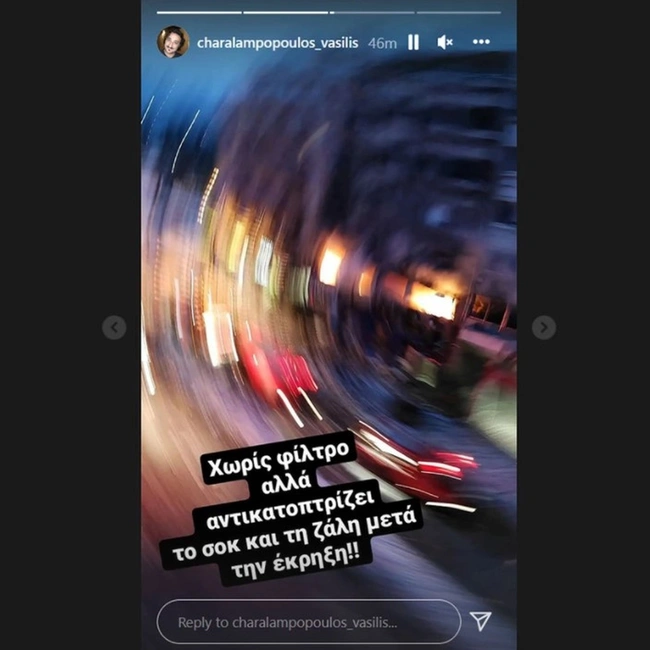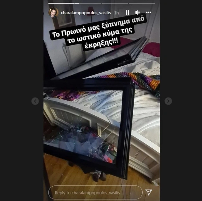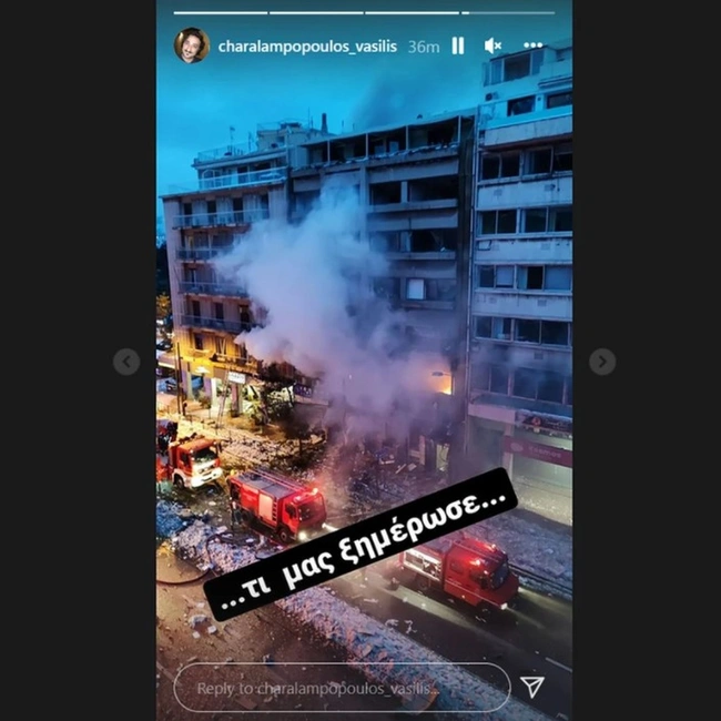 «Το πρωινό μας ξύπνημα από το ωστικό κύμα της έκρηξης», έγραψε πάνω στο πρώτο στιγμιότυπο που δημοσίευσε στον προσωπικό του λογαριασμό στο Instagram ο Βασίλης Χαραλαμπόπουλος.