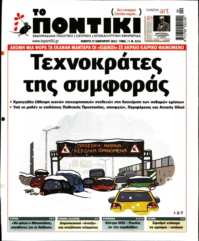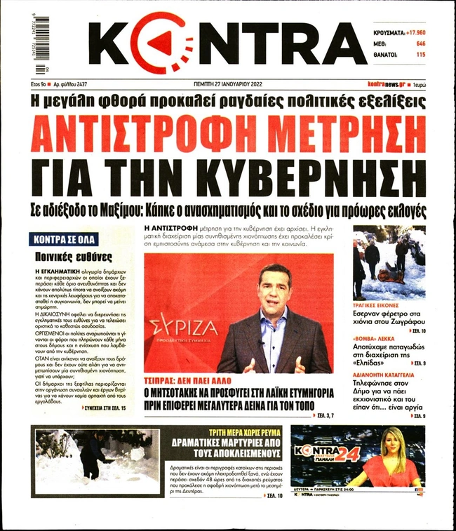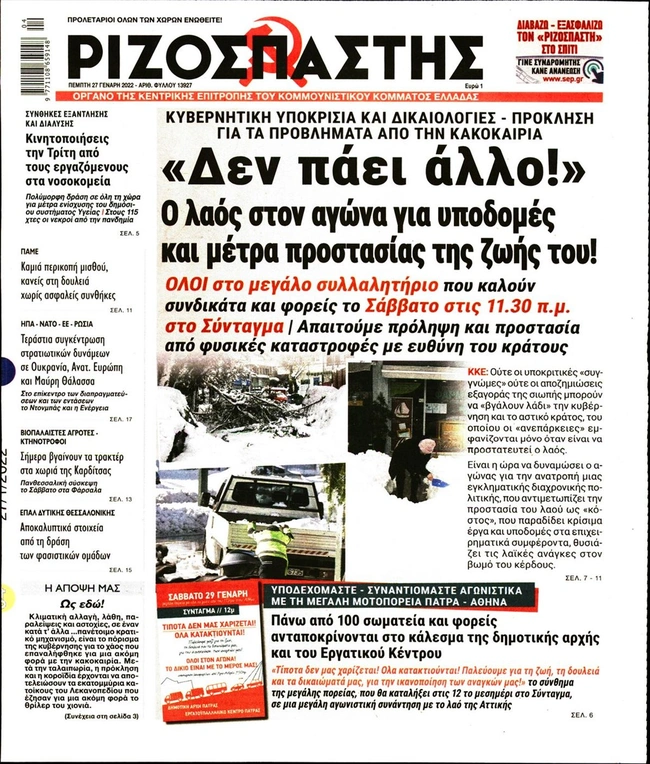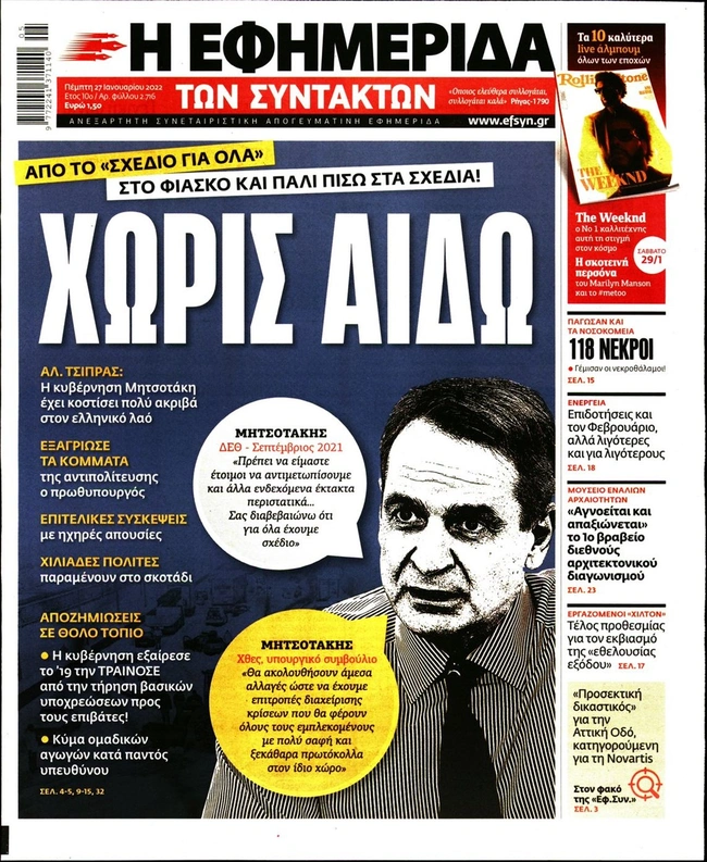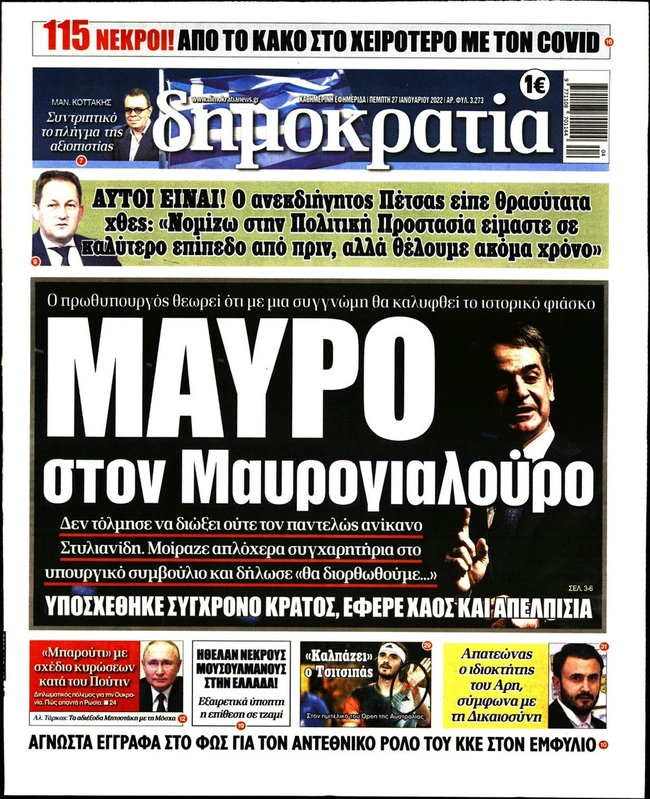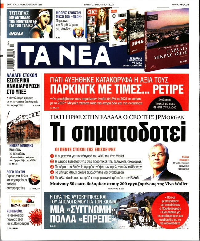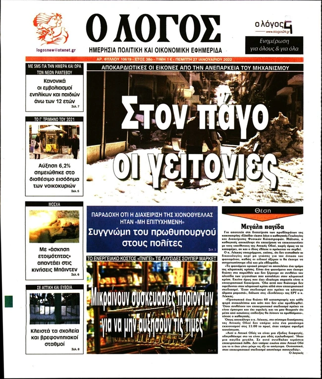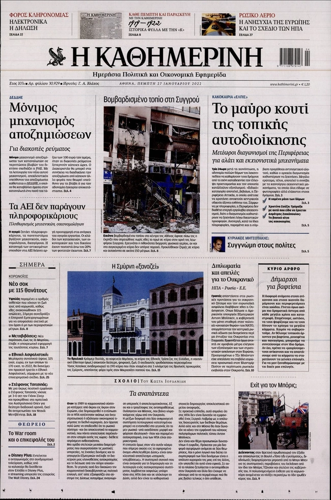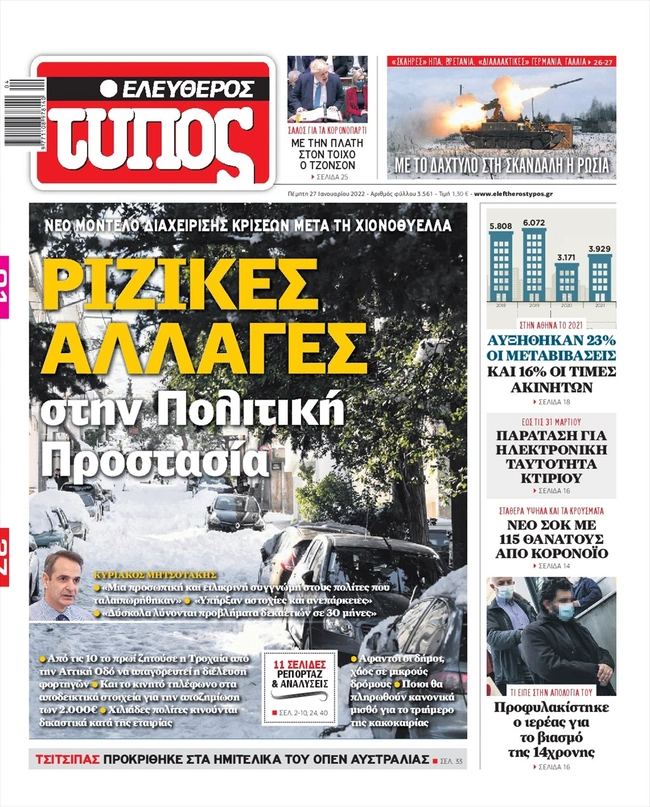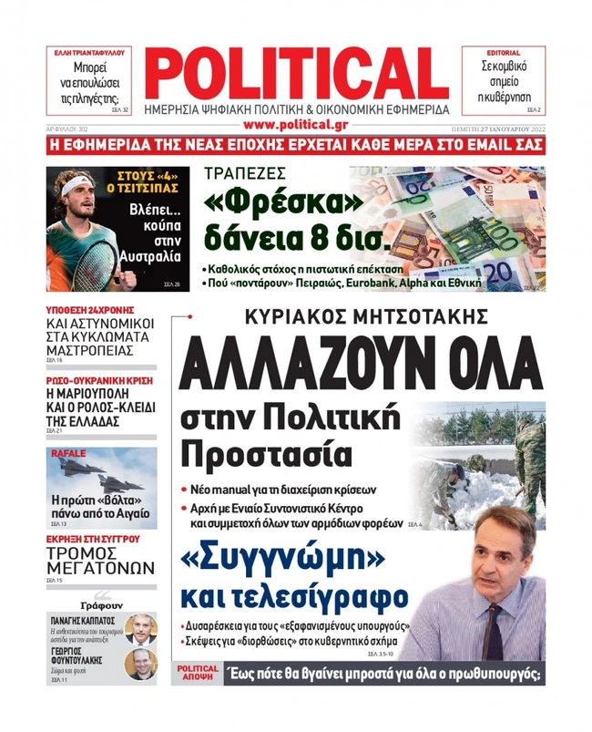 Τα πρωτοσέλιδα των ελληνικών εφημερίδων για σήμερα Πέμπτη 27 Ιανουαρίου. Δείτε τι φιλοξενεί στην πρώτη του σελίδα ο πολιτικός και οικονομικός Τύπος και τα θέματα της επικαιρότητας που ξεχωρίζουν.