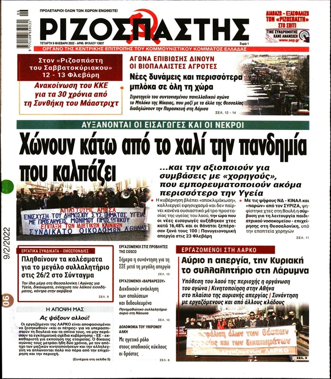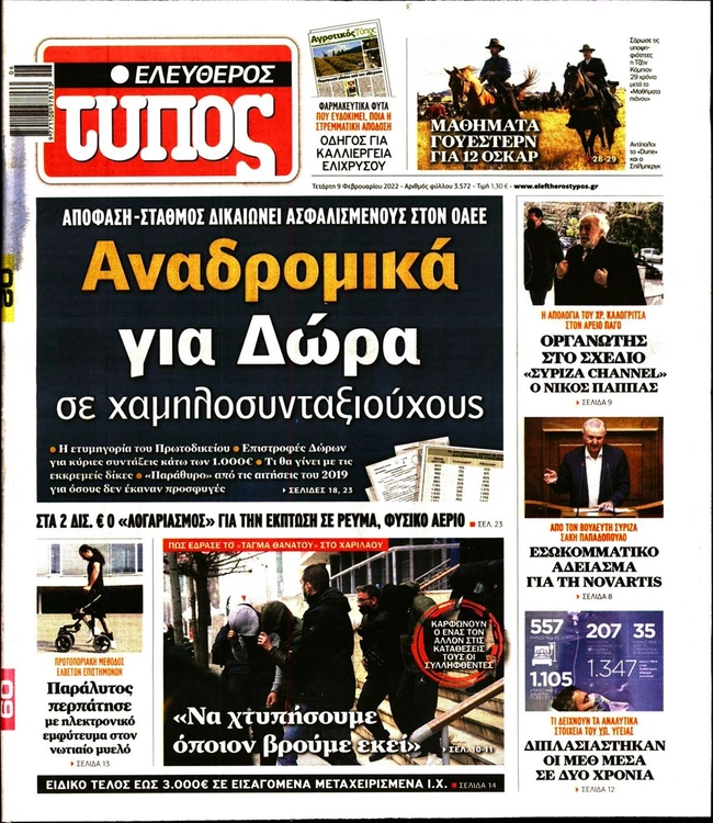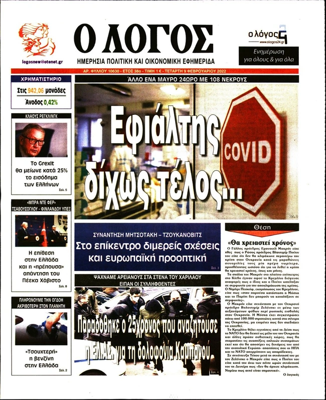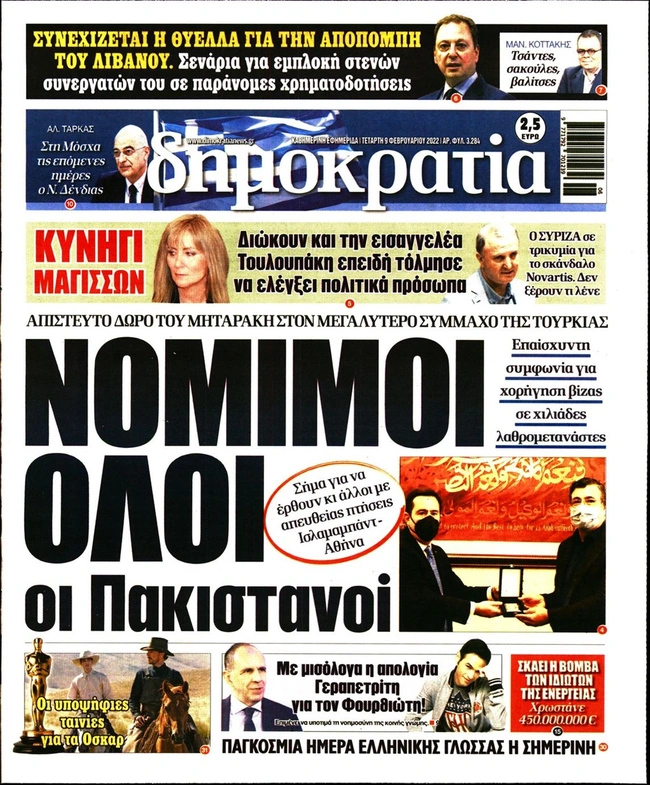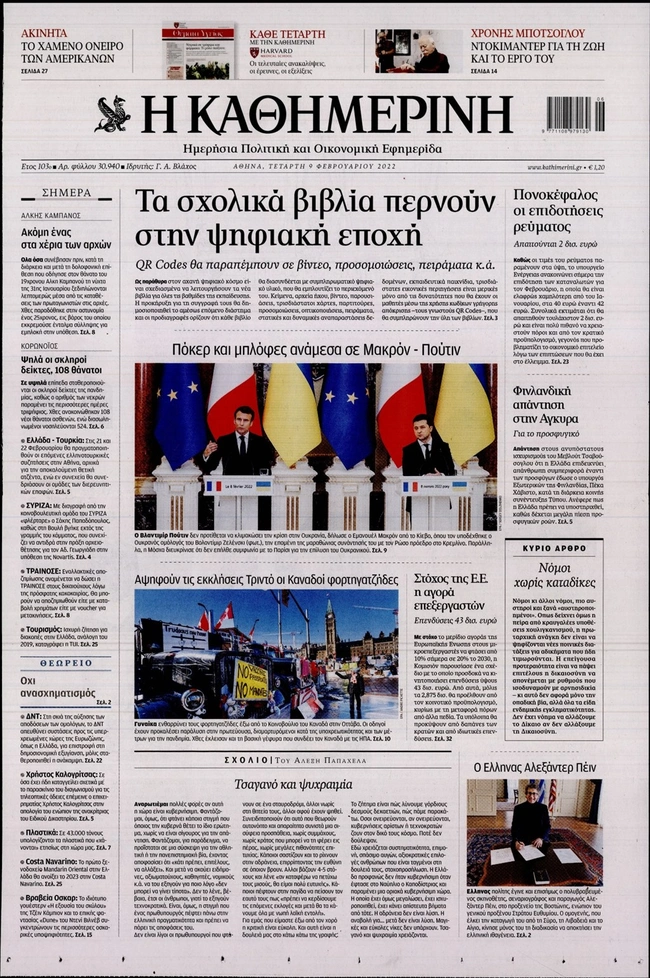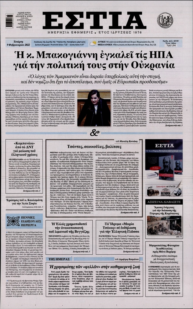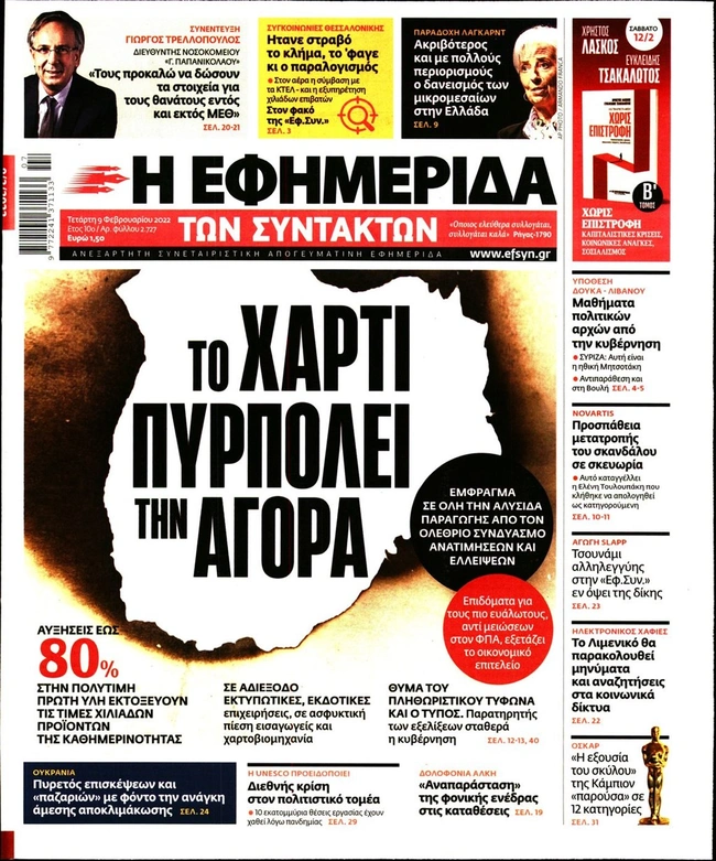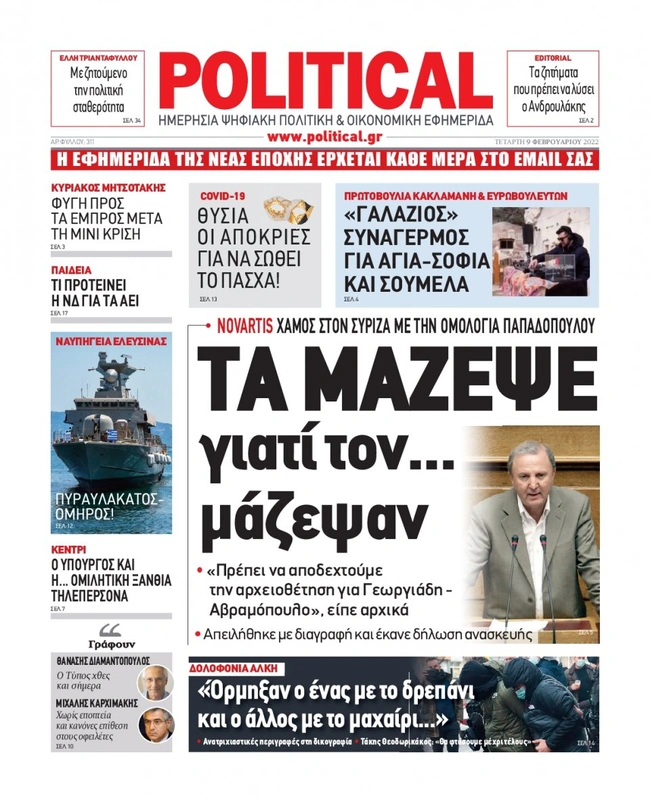 Τα πρωτοσέλιδα των ελληνικών εφημερίδων για σήμερα Τετάρτη 9 Φεβρουαρίου. Δείτε τι φιλοξενεί στην πρώτη του σελίδα ο πολιτικός και οικονομικός Τύπος και τα θέματα της επικαιρότητας που ξεχωρίζουν.