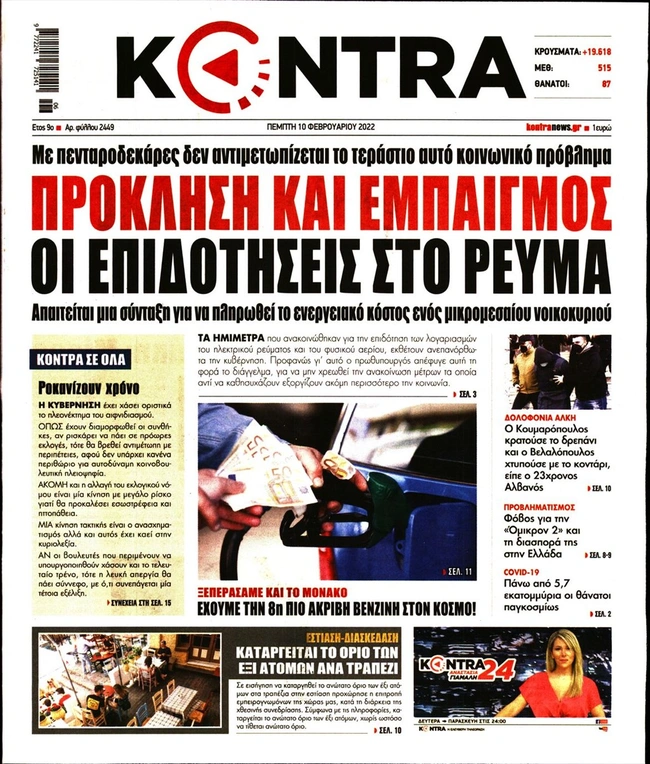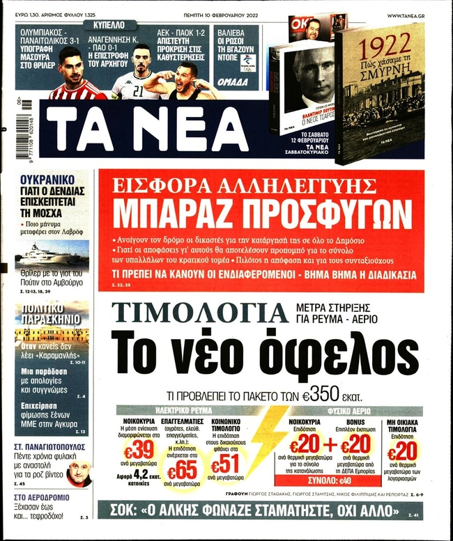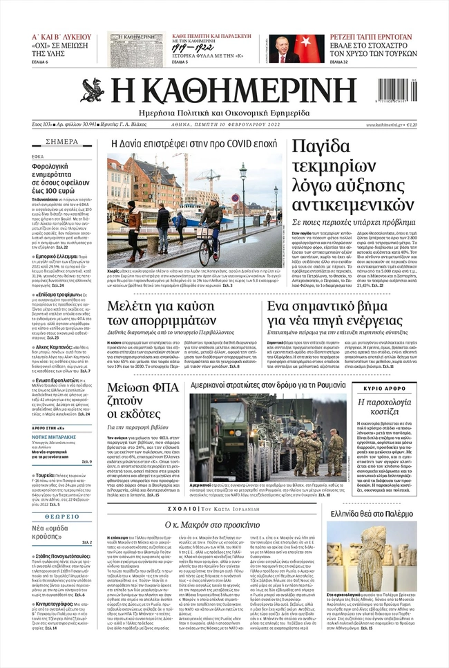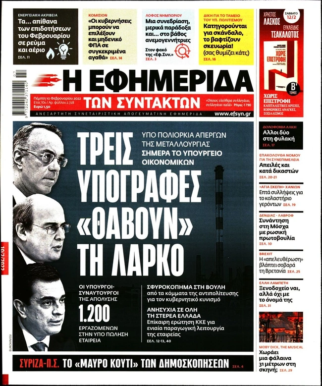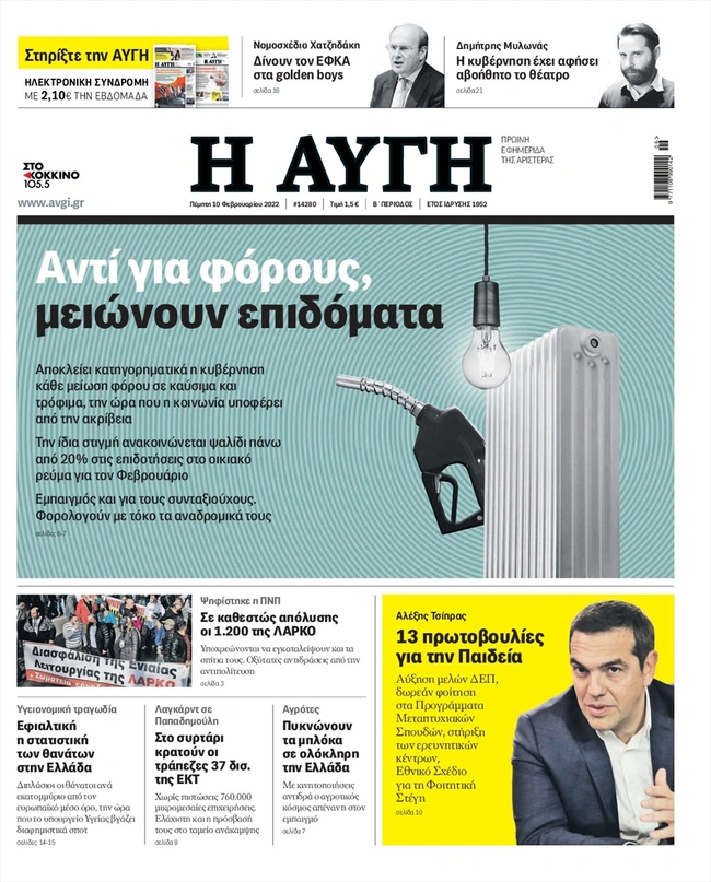 Τα πρωτοσέλιδα των ελληνικών εφημερίδων για σήμερα Πέμπτη 10 Φεβρουαρίου. Δείτε τι φιλοξενεί στην πρώτη του σελίδα ο πολιτικός και οικονομικός Τύπος και τα θέματα της επικαιρότητας που ξεχωρίζουν.