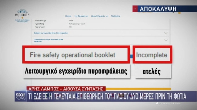 Στο μεταξύ, σύμφωνα με ρεπορτάζ του STAR στο κεντρικό δελτίο ειδήσεων, η τελευταία επιθεώρηση στο πλοίο που τυλίχθηκε στις φλόγες έγινε πριν από δύο μέρες. Ο έλεγχος εντόπισε ελλείψεις στο εγχειρίδιο πυρόσβεσης, όπως αποκαλύπτεται σε έγγραφο- ντοκουμέντο. Ειδικότερα, η επιθεώρηση αναφέρει ότι το λειτουργικό εγχειρίδιο του πλοίου είναι ατελές, όσον αφορά στα ζητήματα πυρασφάλειας. Το έγγραφο αυτό περιλαμβάνεται στη διαδικτυακή βάση δεδομένων Equasis, που έχει αποθηκευμένα τα στοιχεία όλων των πλοίων παγκοσμίως.