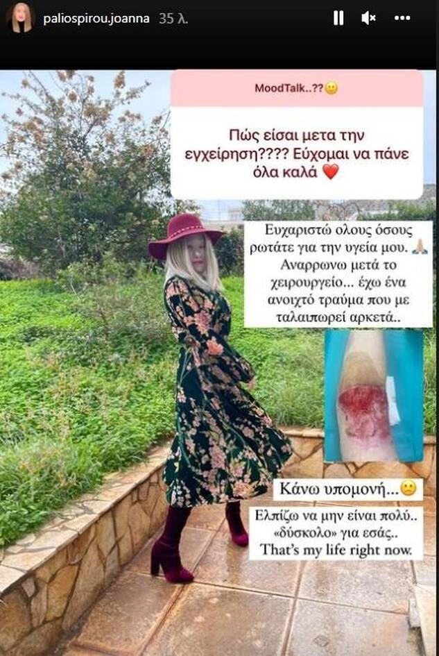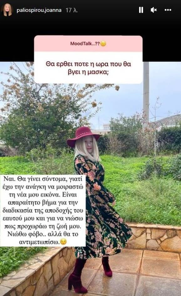 Η Ιωάννα που όλους αυτούς τους μήνες αποτελεί παράδειγμα θάρρους είχε συζήτηση στο Instagram με followers της και απαντώντας σε ερωτήσεις τους, αναφέρεται με μια σειρά από stories στην κατάσταση της υγείας της, την αυτοπεποίθησή της, ενώ αποκαλύπτει ότι σύντομα θα βγάλει τη μάσκα. «Αναρρώνω μετά το χειρουργείο… Έχω ένα ανοιχτό τραύμα που με ταλαιπωρεί αρκετά. Κάνω υπομονή. Ελπίζω να μην είναι πολύ ''δύσκολο'' για εσάς. Αυτή είναι η ζωή μου τώρα», έγραψε η Ιωάννα Παλιοσπύρου.