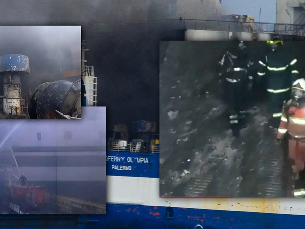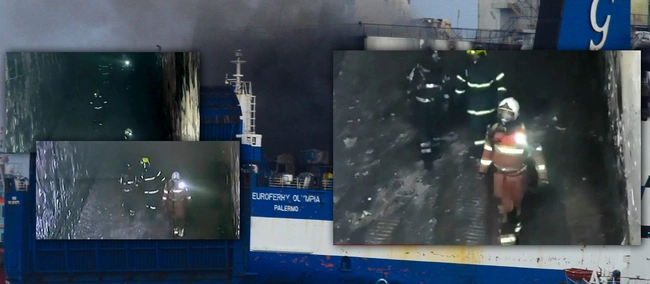 Βίντεο μέσα από το πλοίο Euroferry Olympia, με τους άνδρες των ΕΜΑΚ να συνεχίζουν τις έρευνες για να βρεθούν οι 10 αγνοούμενοι μετά τη φωτιά που ξέσπασε στο πλοίο τα ξημερώματα της Παρασκευής, 18 Φεβρουαρίου, στη θαλάσσια περιοχή βορειονατολικά της Ερεικούσας. Στο εσωτερικό του Euroferry Olympia υπάρχουν, πλέον, μόνο καπνοί και μικρές αναζωπυρώσεις με το πλοίο να έχει οδηγηθεί ρυμουλκούμενο στη θαλάσσια περιοχή βόρεια της Κέρκυρας, όπου ρυμουλκά σκάφη συνεχίζουν τις ρίψεις νερού για να επιτευχθεί η ψύξη των μεταλλικών επιφανειών και η πτώση των θερμοκρασιών.