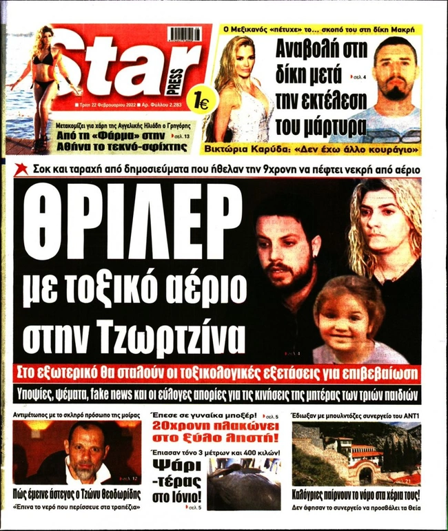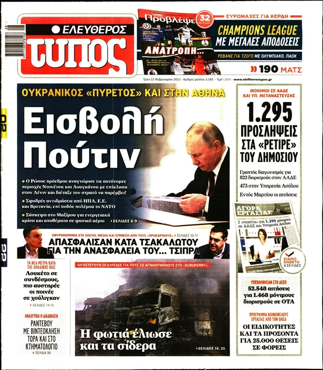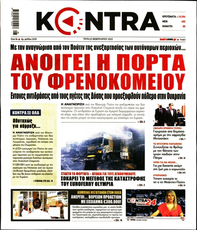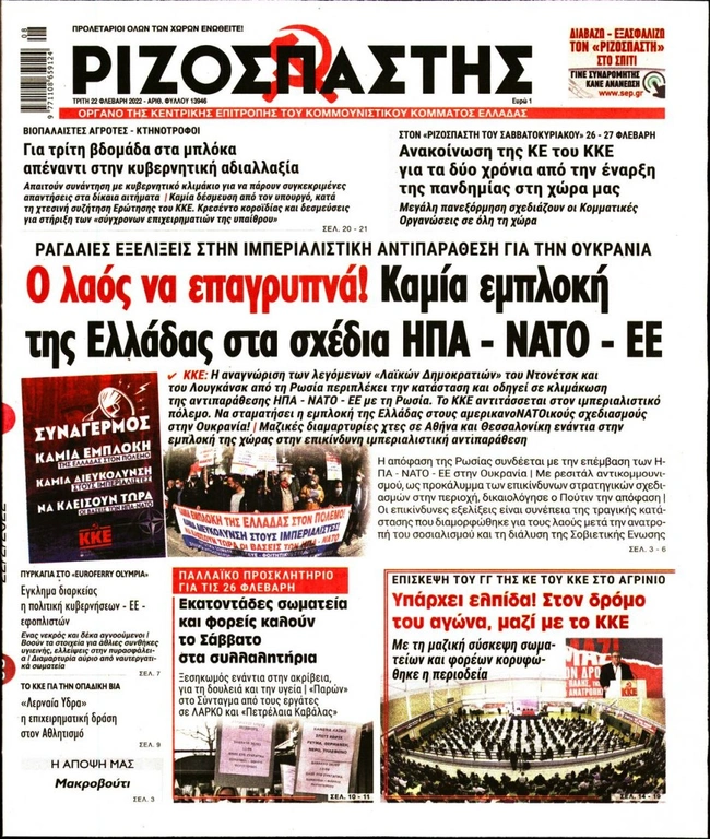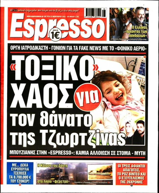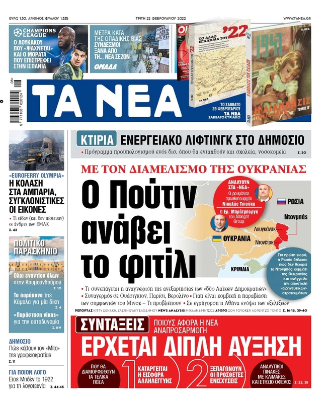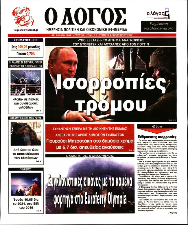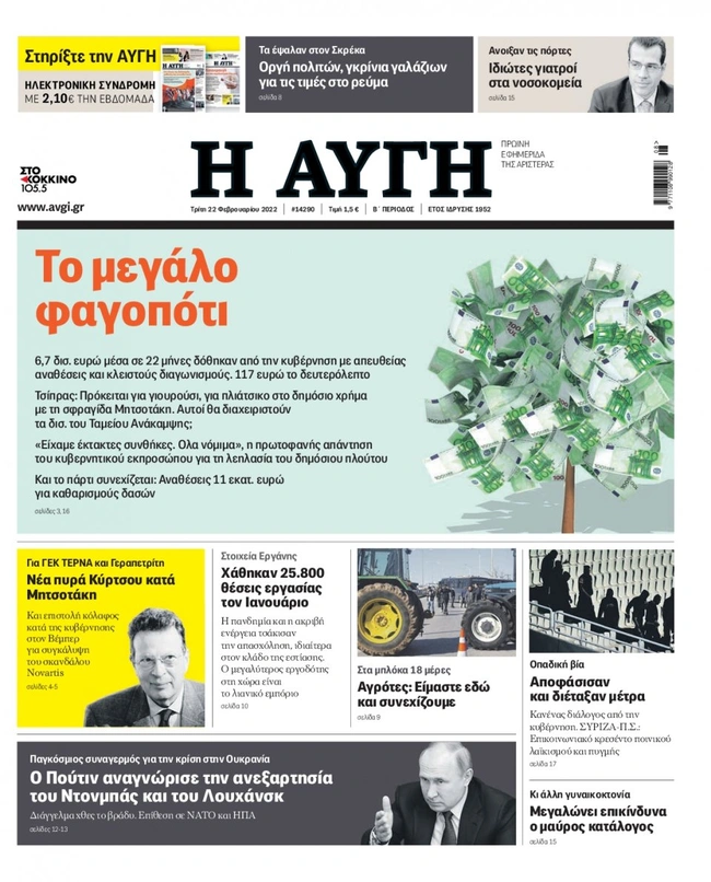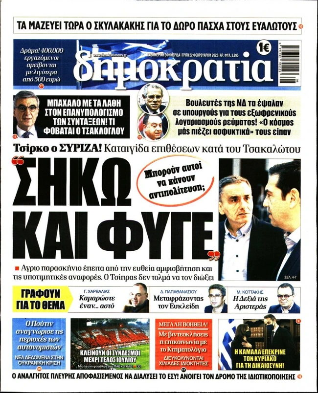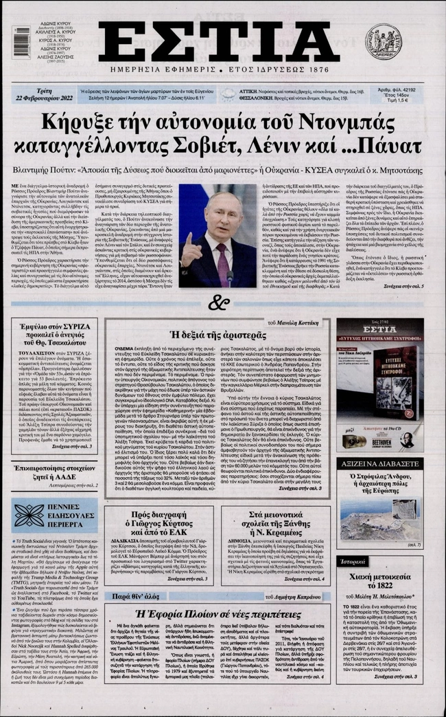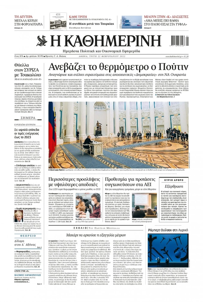 Τα πρωτοσέλιδα των ελληνικών εφημερίδων για σήμερα Τρίτη 22 Φεβρουαρίου. Δείτε τι φιλοξενεί στην πρώτη του σελίδα ο πολιτικός και οικονομικός Τύπος και τα θέματα της επικαιρότητας που ξεχωρίζουν.