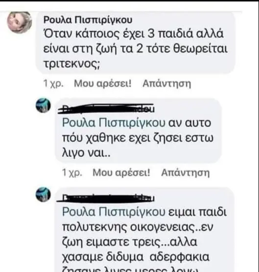 Υπάρχει μια φωτογραφία από μία ερώτηση που είχε κάνει στο Facebook η μητέρα των παιδιών, η οποία ζητεί να μάθει το εξής: «Όταν κάποιος έχει στη ζωή 3 παιδιά αλλά είναι στη ζωή τα 2 τότε θεωρείται τρίτεκνος;». Η χρήστης που το ανέβασε έβαλε την λεζάντα: «Απλά ασχολίαστο». Η παραπάνω φωτογραφία με την ερώτηση της μητέρας, εμφανίζεται στα σχόλια κάτω από ανάρτηση του πατέρα στις 29 Δεκεμβρίου.