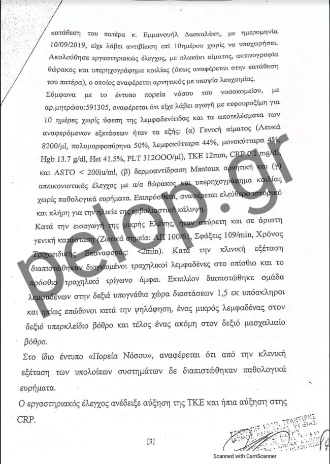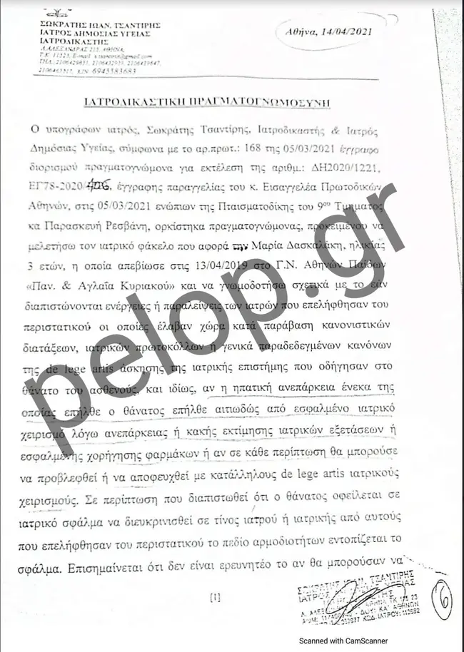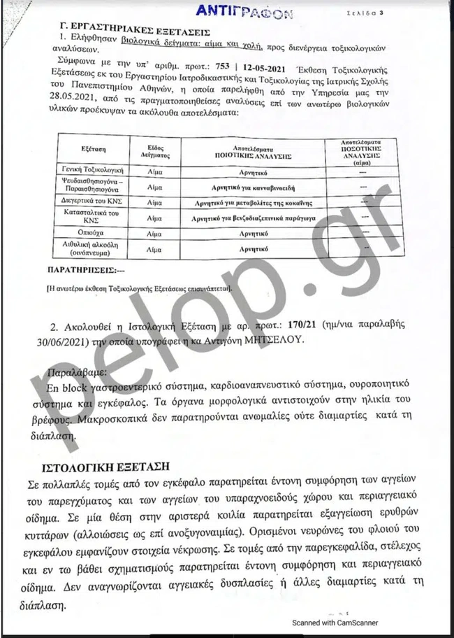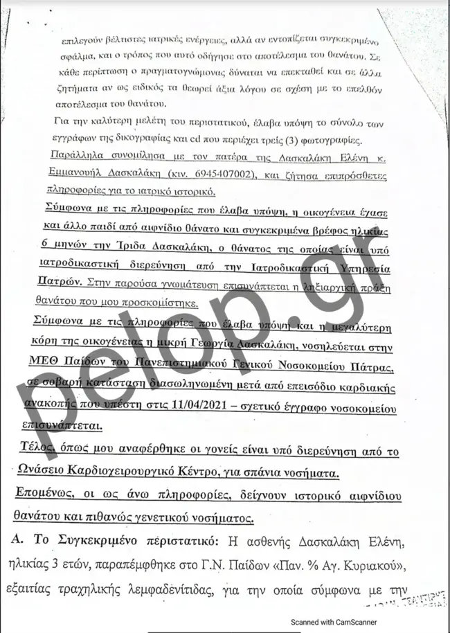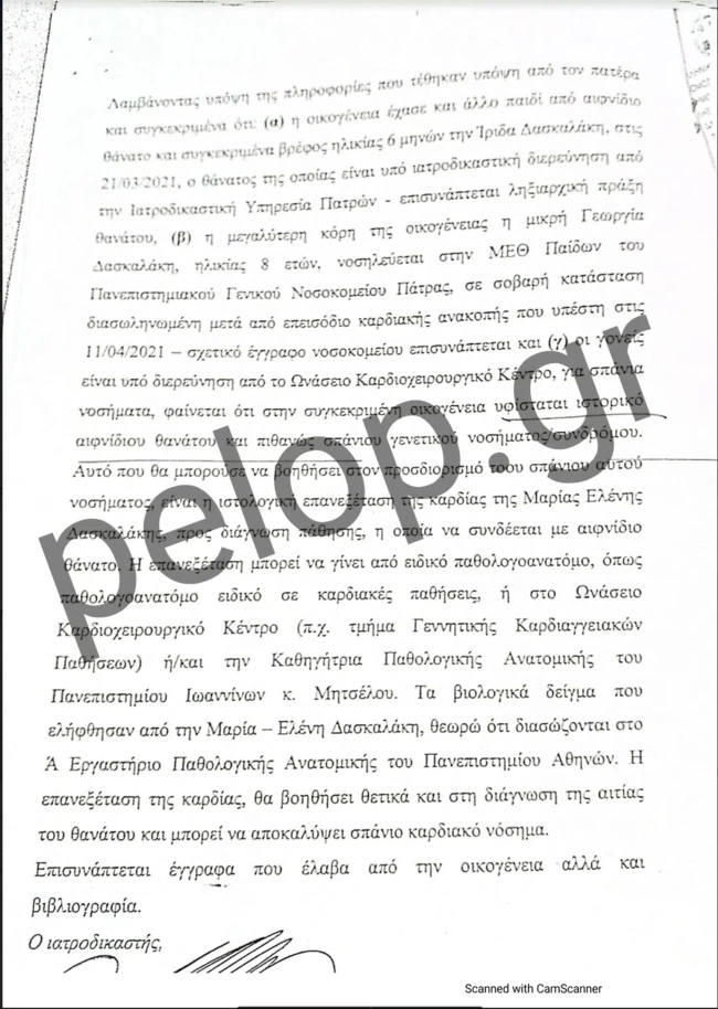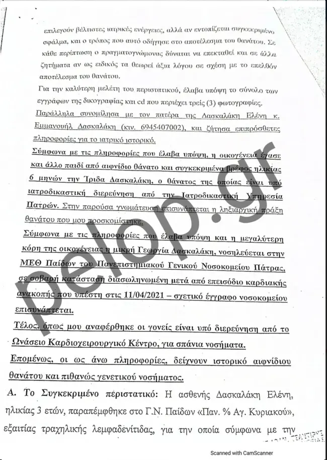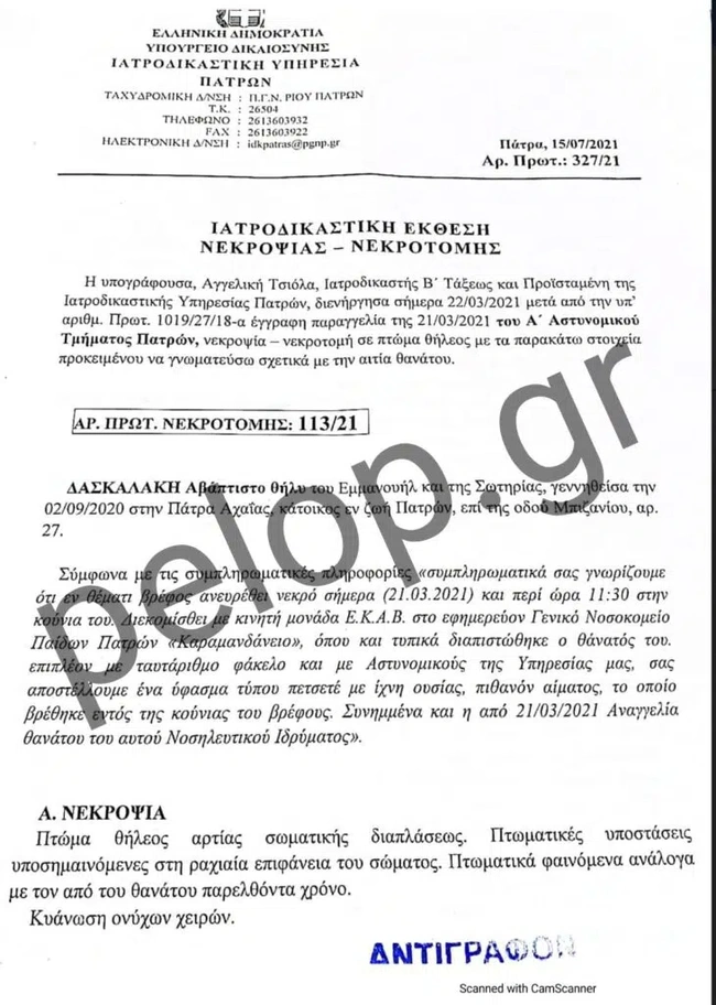 Στην ιατροδικαστική έκθεση νεκροψίας – νεκροτομής που δημοσιεύει το pelop.gr και διενήργησε η προϊσταμένη της Ιατροδικαστικής Υπηρεσίας Πατρών, ιατροδικαστής Αγγελική Τσιόλα, στις 22 Μαρτίου του 2021, αναφέρεται πως το αβάπτιστο τέκνο της οικογένειας Δασκαλάκη βρέθηκε νεκρό μια ημέρα νωρίτερα, δηλαδή στις 21 Μαρτίου και περί ώρα 11.30 στην κούνια του. Διακομίστηκε με μονάδα του ΕΚΑΒ στο Καραμανδάνειο, όπου τυπικά διαπιστώθηκε ο θάνατός του. Μαζί, εστάλη από το 1ο Αστυνομικό Τμήμα και ένα ύφασμα τύπου πετσετέ με ίχνη ουσίας, πιθανόν αίματος το οποίο είχε βρεθεί στην κούνια του βρέφους.