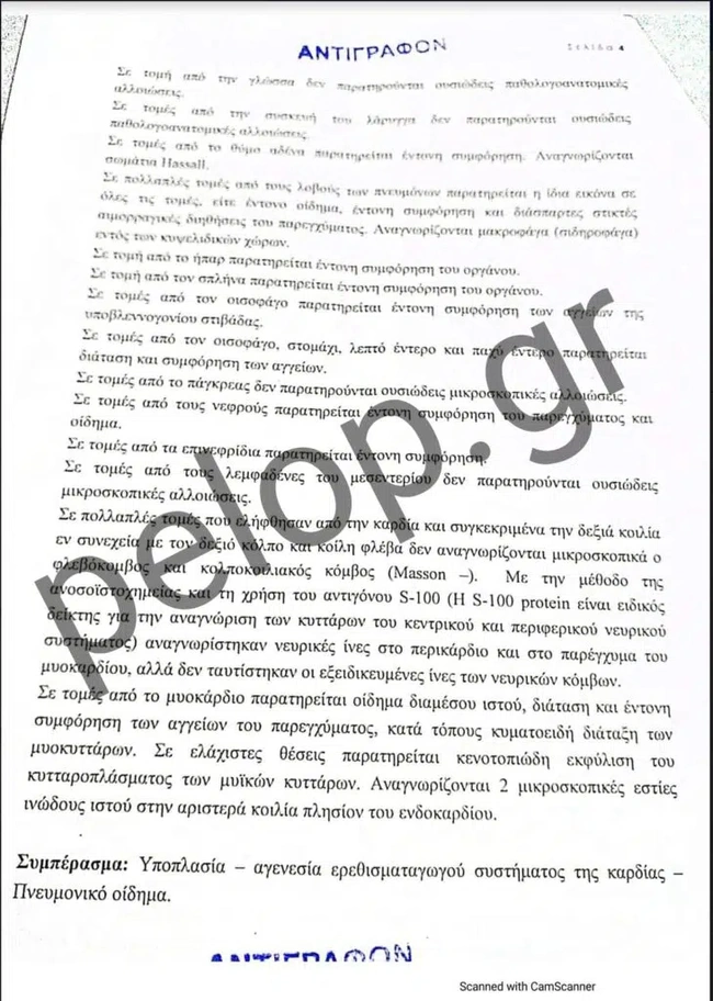 Στο πόρισμα αναφέρεται ότι εξωτερικά στο σώμα δεν βρέθηκαν κακώσεις. Επίσης, κακώσεις δεν βρέθηκαν στο κεφάλι, ούτε και σε άλλα σημεία όργανα του σώματος κατά την νεκροτομή που ακολούθησε. Η τραχεία ήταν ελεύθερη χωρίς την παρουσία ξένου σώματος, ενώ στους πνεύμονες εντοπίστηκε εικόνα πνευμονικού οιδήματος. Στην καρδιά δεν παρατηρήθηκαν ισχαιμικές ή αθηροσκληρυντικές αλλοιώσεις. Οι δε εργαστηριακές εξετάσεις, ήταν όλες αρνητικές σε τοξικές και άλλες ουσίες.