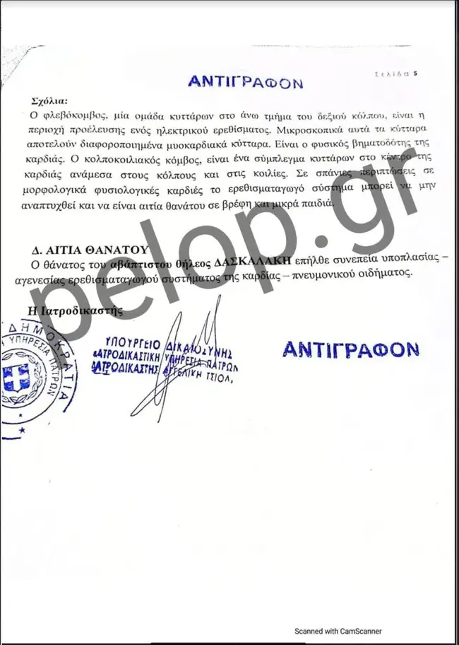 Στην ιστολογική εξέταση όμως που ακολούθησε, σε πολλαπλές τομές που ελήφθησαν από την καρδιά, δεν αναγνωρίστηκαν μικροσκοπικά ο φλεβοκόμβος και κολποκοιλιακός κόμβος. Οπως αναφέρεται χαρακτηριστικά στο πόρισμα, «ο φλεβοκόμβος, μια ομάδα κυττάρων στο άνω τμήμα του δεξιού κόλπου της καρδιάς, είναι η περιοχή προέλευσης ενός ηλεκτρικού ερεθίσματος. Μικροσκοπικά αυτά τα κύτταρα αποτελούν διαφοροποιημένα μυοκαρδιακά κύτταρα. Είναι ο φυσιολογικός βηματοδότης της καρδιάς. Ο κολποκοιλιακός κόμβος, είναι ένα σύμπλεγμα κυττάρων στο κέντρο της καρδιάς ανάμεσα στους κόλπους και στις κοιλίες. Σε σπάνιες περιπτώσεις σε μορφολογικά φυσιολογικές καρδιές το ερεθισματογωγό σύστημα, μπορεί να μην αναπτυχθεί και να είναι αιτία θανάτου σε βρέφη και μικρά παιδιά. Ως συμπέρασμα, ο θάνατος του αβάπτιστου θηλέος Δασκαλάκη, επήλθε συνεπεία υποπλασίας – αγενεσίας ερεθισματαγωγού συστήματος της καρδιάς – πνευμονικού οιδήματος».