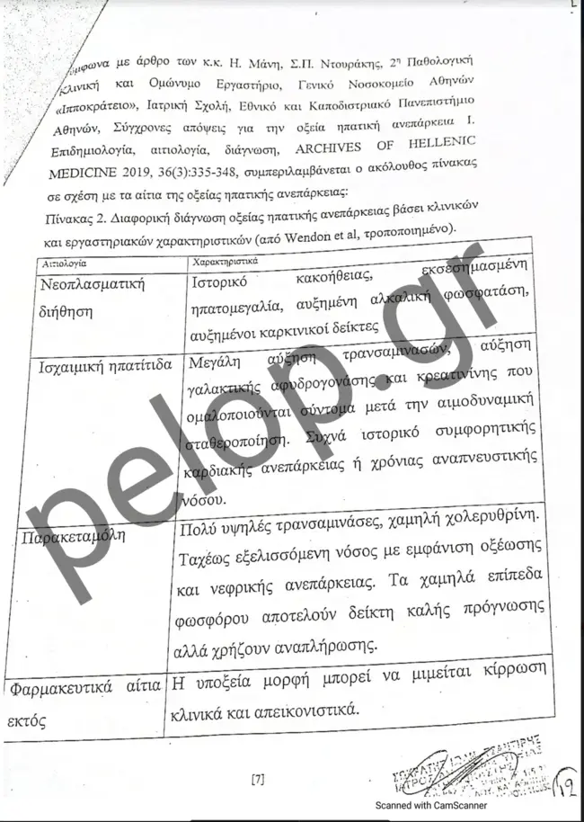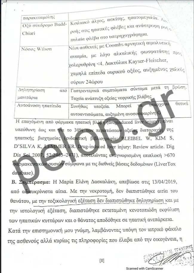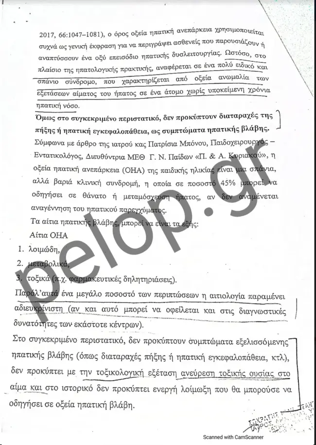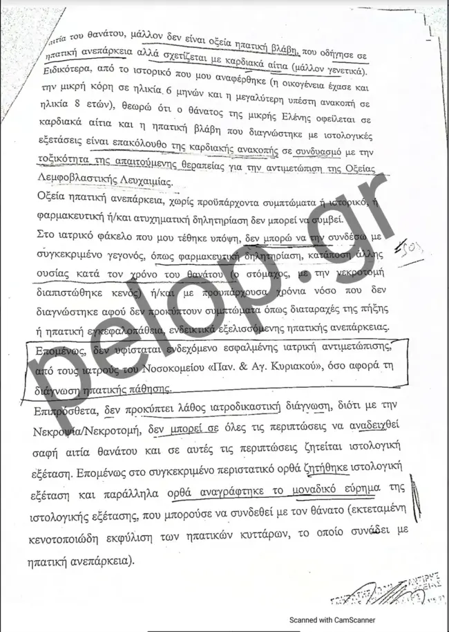 Ο πραγματογνώμονας αναφέρει σε άλλο σημείο του πορίσματός του, ότι με βάση τα στοιχεία που τέθηκαν στη διάθεσή του, ο θάνατος του παιδιού σχετίζεται με αιτίες που περιγράφονται παραπάνω. Σημειώνει δε, ότι αυτή η ηπατική βλάβη εξελίχθηκε αιφνίδια, διότι δεν προκύπτει από το ιστορικό εύρημα χρόνια – προϋπάρχουσα ηπατική νόσος. Επίσης, σημειώνεται ότι στο αποτέλεσμα της ιστολογικής εξέτασης καταγράφεται ότι κατά την εξέταση της καρδιάς δεν διαπιστώθηκαν ιστοπαθολογικές αλλοιώσεις ορατές στο σχετικό έγγραφο.