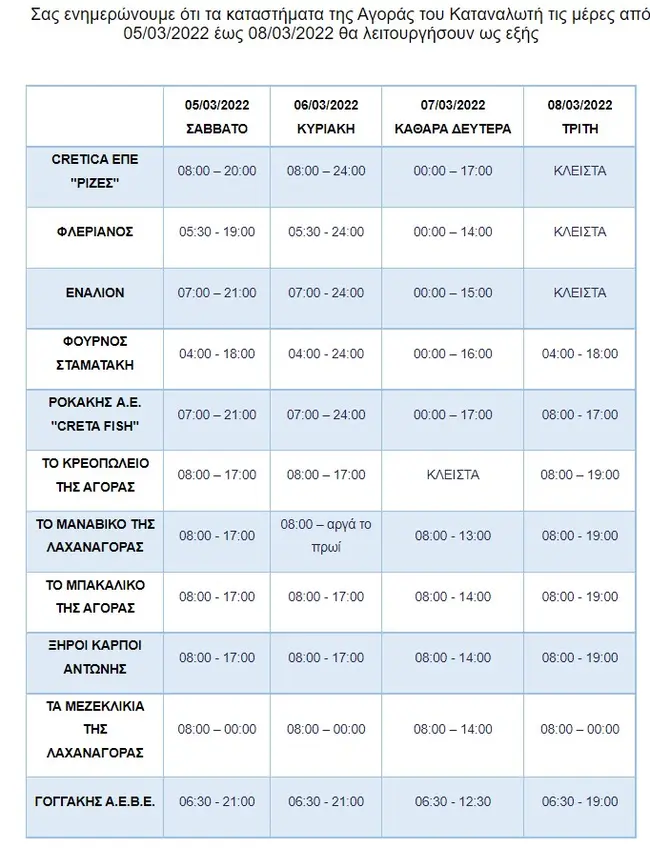 Ανοικτή θα είναι και η Βαρβάκειος στο κέντρο της Αθήνας. Τα αρτοποιία μένουν επίσης ανοιχτά για την παραδοσιακή λαγάνα, αλλά και τα ζαχαροπλαστεία καθώς και τα ιχθυοπωλεία. Τα σούπερ μάρκετ θα είναι κλειστά, ωστόσο, ανοικτά θα είναι τα μίνι μάρκετ. Στο μεταξύ στην ηλεκτρονική σελίδα του ΟΚΑΑ έχει αναρτηθεί το ωράριο των καταστημάτων της Αγοράς του Καταναλωτή για τις μέρες από 5 Μαρτίου 2022 έως και 8 Μαρτίου 2022 από όπου προκύπτει ότι ο φούρνος και τα ιχθυοπωλεία θα παραμείνουν ανοικτά όλο το βράδυ μέχρι το απόγευμα της Καθαράς Δευτέρας.