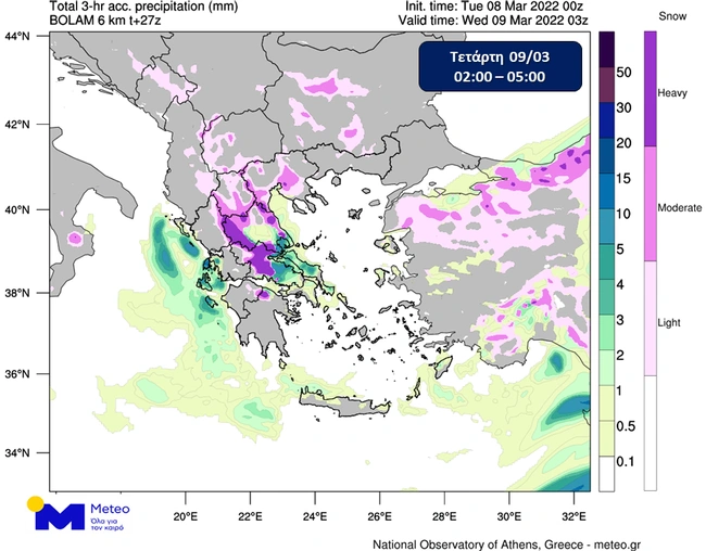 Στην παρακάτω ομάδα χαρτών, παρουσιάζονται τα εκτιμώμενα ύψη βροχόπτωσης και έντασης χιονόπτωσης για επιλεγμένα τρίωρα, κατά τη διάρκεια των μεσημεριανών (14:00-17:00) και απογευματινών ωρών (17:00-20:00) της Τρίτης 08/03, καθώς επίσης και των πρώτων πρωινών ωρών (02:00-05:00) της Τετάρτης 09/03/2022: