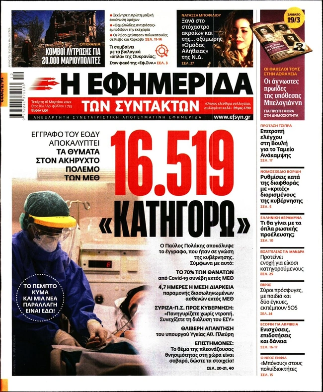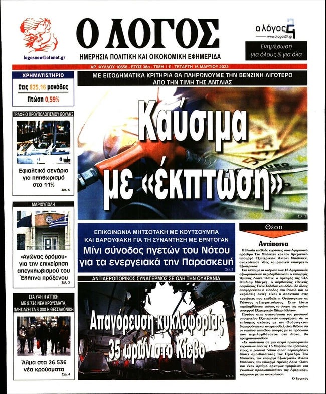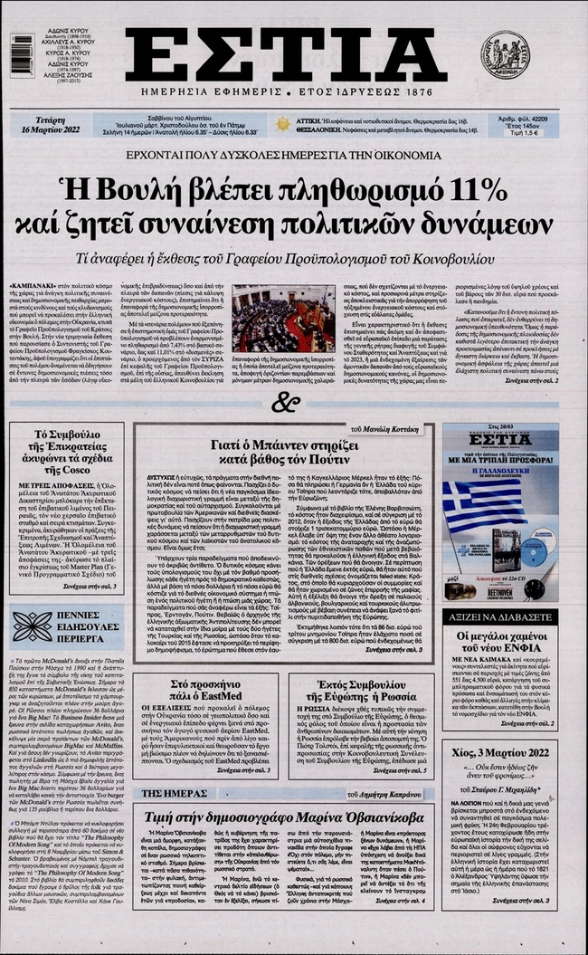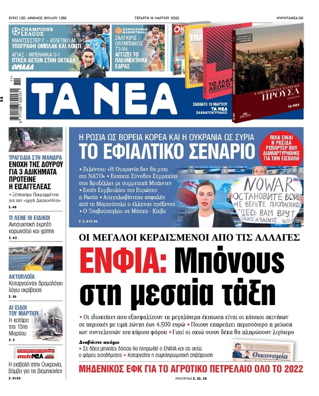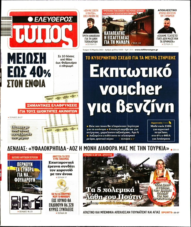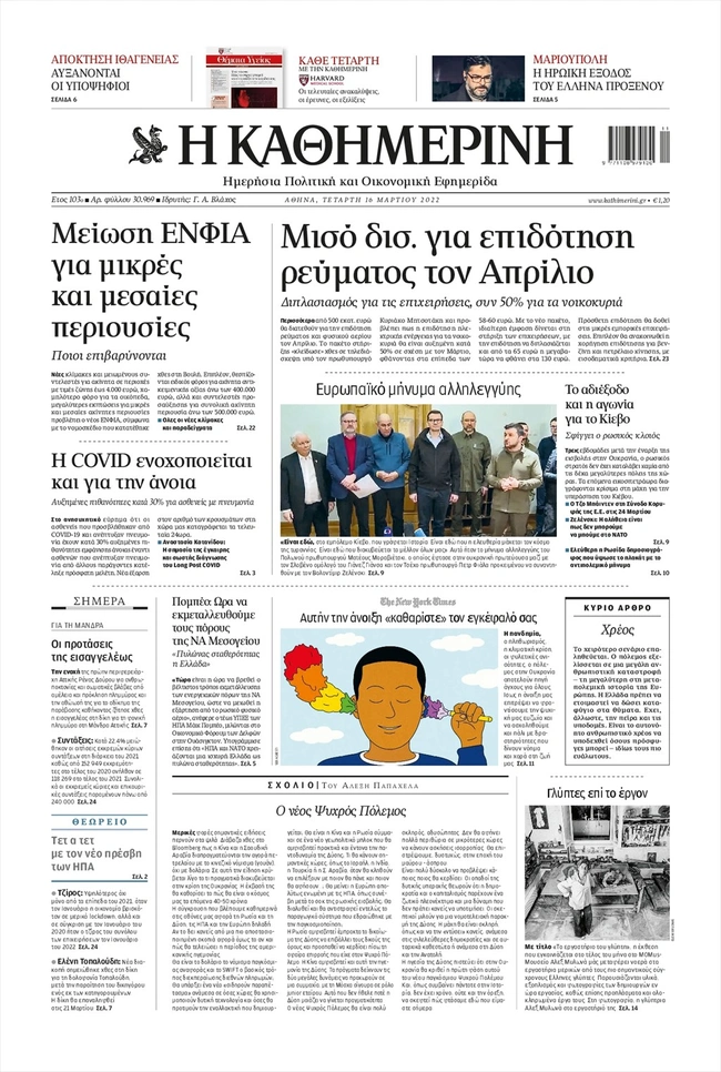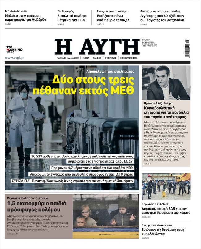 Τα πρωτοσέλιδα των ελληνικών εφημερίδων για σήμερα Τετάρτη 16 Μαρτίου. Δείτε τι φιλοξενεί στην πρώτη του σελίδα ο πολιτικός και οικονομικός Τύπος και τα θέματα της επικαιρότητας που ξεχωρίζουν.