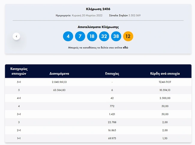 Σήμερα, Κυριακή 20 Μαρτίου 2022, στην κλήρωση Τζόκερ (2416) του ΟΠΑΠ, μοιράζεται στους τυχερούς της πρώτης κατηγορίας το ποσό των 2.000.000 ευρώ. Οι τυχεροί αριθμοί στη σημερινή κλήρωση Τζόκερ είναι οι εξής: 4, 7, 18, 32, 38 και Τζόκερ ο αριθμός 12.