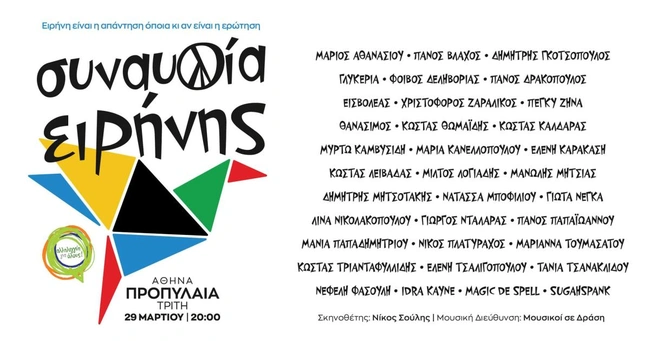 Στον απόηχο του αιματοκυλίσματος που βρίσκεται σε εξέλιξη στην Ουκρανία μετά τη ρωσική εισβολή στη χώρα στις 24 Φεβρουαρίου 2022, πολλοί καλλιτέχνες προσπαθούν με το δικό τους τρόπο να δηλώσουν την εναντίωσή τους στον πόλεμο και να απευθύνουν έκκληση για ειρήνη. Ετσι λοιπόν, σχεδιάστηκε και μία σημαντική πρωτοβουλία από πολλούς Ελληνες καλλιτέχνες, μία «συναυλία ειρήνης», όπως αναφέρεται εύγλωττα στην αφίσα της εκδήλωσης, η οποία είναι προγραμματισμένη να διεξαχθεί στα Προπύλαια, την Τρίτη 29 Μαρτίου στις 20:00.