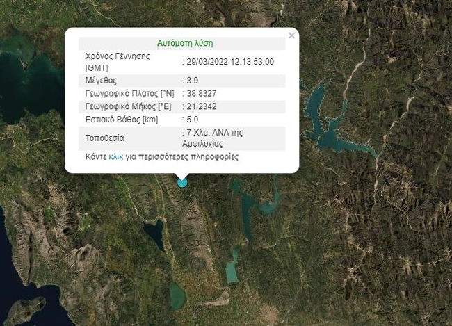 Σεισμική δόνηση μεγέθους 3,9 βαθμών της κλίμακας Ρίχτερ σημειώθηκε το μεσημέρι της Τρίτης στην Αμφιλοχία. Σύμφωνα με το Γεωδυναμικό ινστιτούτο, το επίκεντρο του σεισμού εντοπίζεται στα 9 χιλιόμετρα ανατολικά της Αμφιλοχίας, ενώ το εστιακό του βάθος υπολογίζεται στα 5 χιλιόμετρα.
