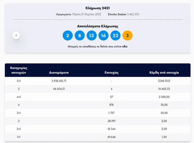 Σήμερα, Πέμπτη 31 Μαρτίου 2022, στην κλήρωση Τζόκερ (2421) του ΟΠΑΠ, μοιράζεται στους τυχερούς της πρώτης κατηγορίας ποσό άνω των 3.800.000 ευρώ. Οι τυχεροί αριθμοί στη σημερινή κλήρωση Τζόκερ είναι οι εξής: 2, 8, 13, 16, 23 και Τζόκερ ο αριθμός 3.