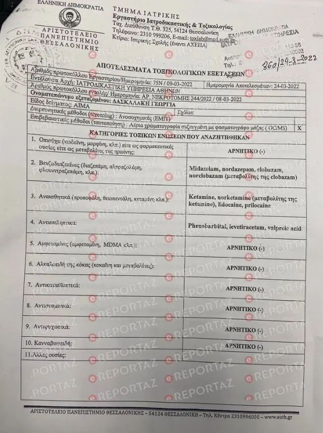 Οπως αναφέρεται σε δημοσίευμα του ereportaz.gr και του Πέτρου Κουσουλού, στο σώμα της Τζωρτζίνας βρέθηκαν πέραν της κεταμίνης και άλλες ουσίες. Συγκεκριμένα, από τον τοξικολογικό έλεγχο που έγινε στην Ιατροδικαστική Υπηρεσία Αθηνών φαίνεται να έχει εντοπιστεί εκτός από την κεταμίνη και νορκεταμίνη (μεταβολίτης της κεταμίνης), καθώς και λιδοκαΐνη και πριλοκαΐνη. Σύμφωνα με τις ίδιες πληροφορίες πλέον και οι συγκεκριμένες ουσίες έχουν μπει στο στόχαστρο και αναμένεται να πραγματοποιηθεί ποσοτικός έλεγχος.