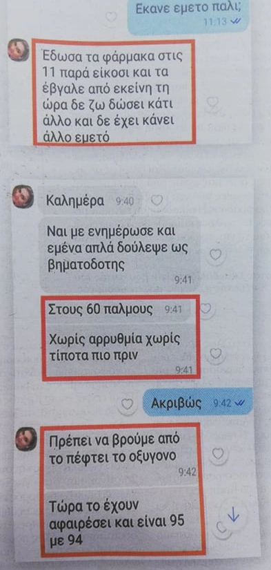 Μάλιστα, η 33χρονη σε επικοινωνία της με τους γιατρούς επισήμαινε ότι «πρέπει να βρούμε από τι πέφτει το οξυγόνο». Λέγοντας χαρακτηριστικά σε γιατρούς ότι «μη σας νοιάζει για μένα και τη συμπεριφορά μου, εγώ είμαι «παγοκολόνα»!