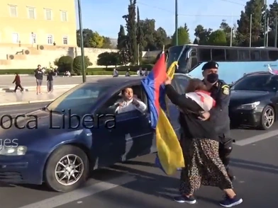 Υπήρξαν αντεγκλήσεις με χειρονομίες, μούντζες κι εκατέρωθεν βρισιές με τις Αρχές να επεμβαίνουν αρκετές φορές για να ηρεμήσουν τα πνεύματα. Από την προσοχή τους ωστόσο, διέλαθε μια γυναίκα μεγάλης ηλικίας, η οποία φορώντας μία σημαία της Γεωργίας στην πλάτη και κρατώντας ένα κοντάρι με τη σημαία της Ουκρανίας στα χέρια, έκανε μόνη της «ντου» σε αυτοκίνητα Ρώσων που περνούσαν μπροστά από τους Ουκρανούς και τους προκαλούσαν.