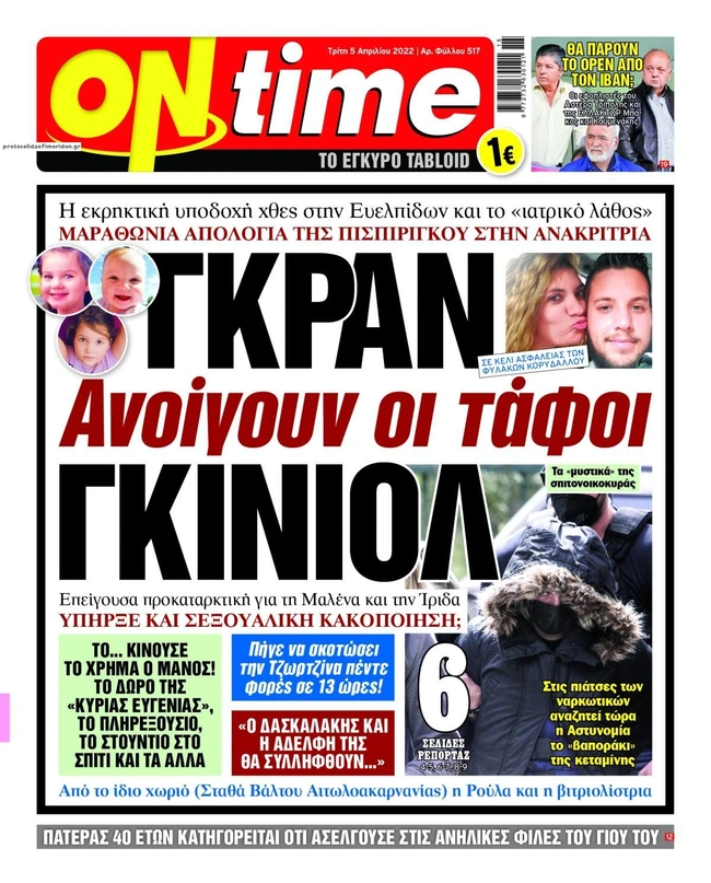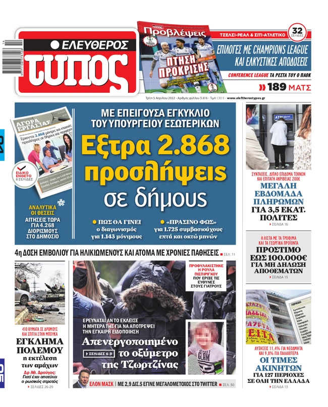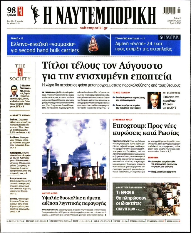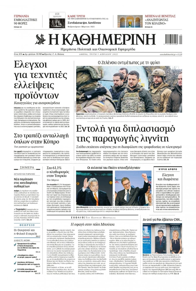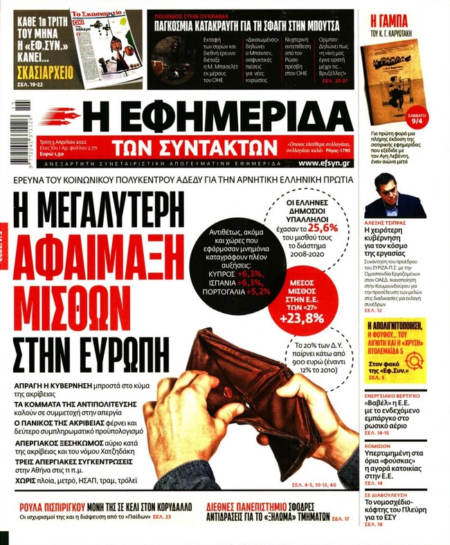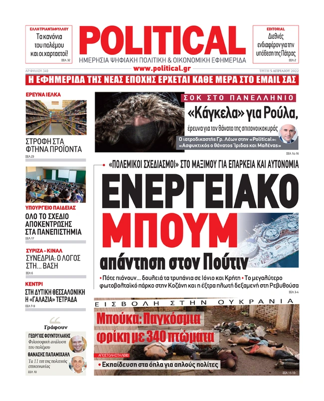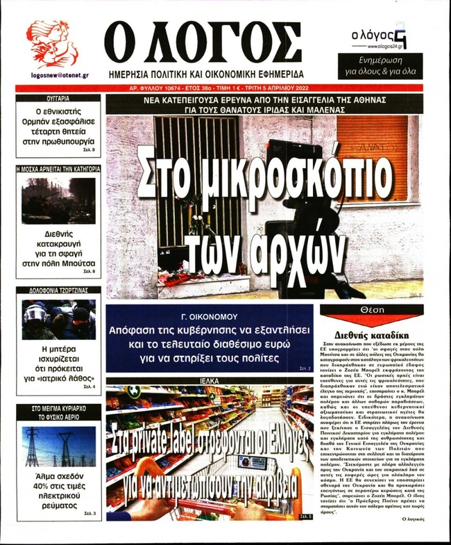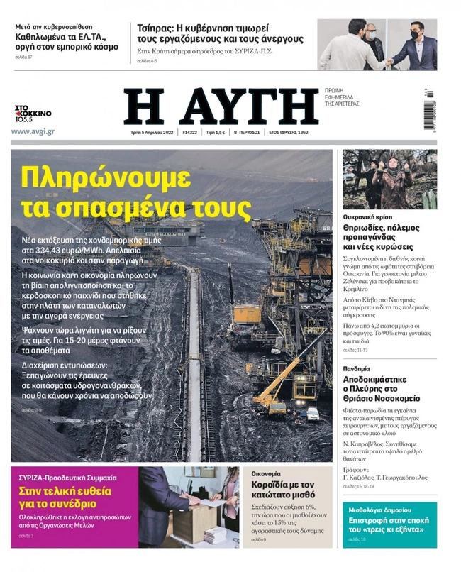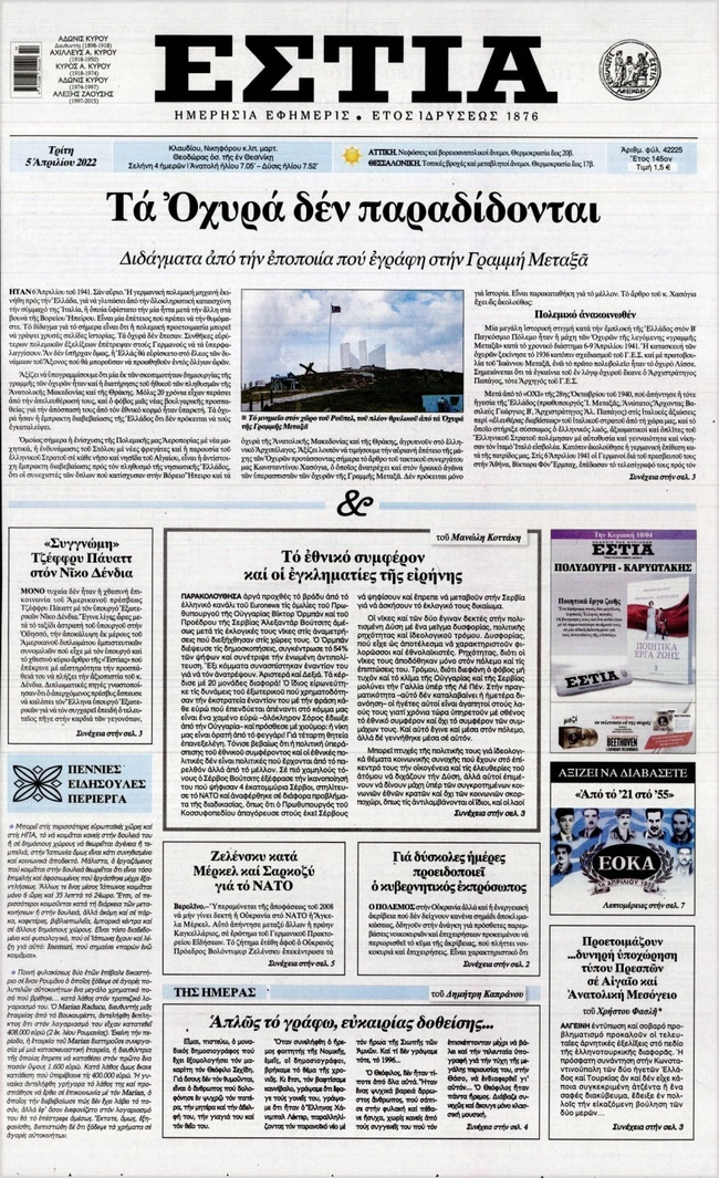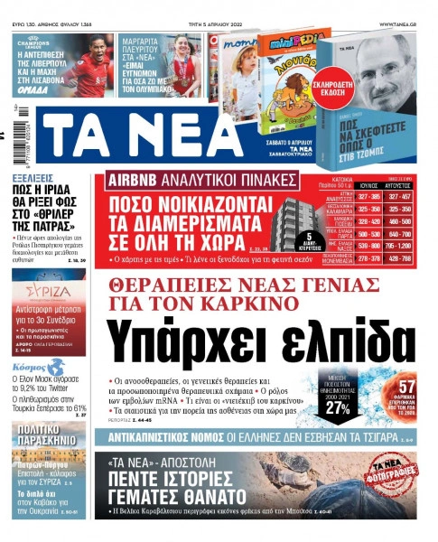 Τα πρωτοσέλιδα των ελληνικών εφημερίδων για σήμερα Τρίτη 5 Απριλίου. Δείτε τι φιλοξενεί στην πρώτη του σελίδα ο πολιτικός και οικονομικός Τύπος και τα θέματα της επικαιρότητας που ξεχωρίζουν.