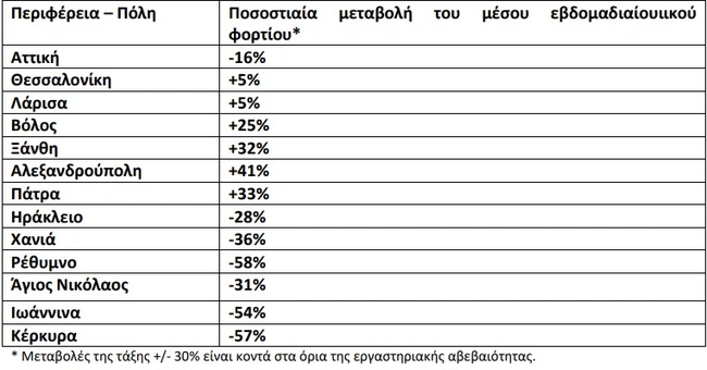 Την εβδομάδα 28 Μαρτίου έως 3 Απριλίου 2022 παρατηρήθηκαν αυξητικές τάσεις, σε σχέση με την εβδομάδα 21 έως 27 Μαρτίου 2022, στο μέσο εβδομαδιαίο ιικό φορτίο του SARS-CoV-2 στα αστικά λύματα σε τέσσερεις από τις δεκατρείς (4/13) περιοχές που ελέγχθηκαν από το Εθνικό Δίκτυο Επιδημιολογίας Λυμάτων (ΕΔΕΛ) του ΕΟΔΥ, πτωτικές τάσεις σε επτά από τις δεκατρείς (7/13) περιοχές του ΕΔΕΛ και σταθεροποιητικές τάσεις σε δύο από τις δεκατρείς (2/13) περιοχές που ελέγχθηκαν από το ΕΔΕΛ. Καθαρά αυξητικές τάσεις παρατηρήθηκαν στην Ξάνθη (+32%), στην Πάτρα (+33%) και στην Αλεξανδρούπολη (+41%), ενώ οριακή ήταν η αύξηση στο Βόλο (+25%). Καθαρά πτωτικές τάσεις παρατηρήθηκαν στον Άγιο Νικόλαο (-31%), στα Χανιά (-36%), στα Ιωάννινα (-54%), στην Κέρκυρα (-57%) και στο Ρέθυμνο (-58%), ενώ οριακή ήταν η μείωση στην Περιφέρεια Αττικής (-16%) και στο Ηράκλειο (-28%). Το ιικό φορτίο των αστικών λυμάτων παρέμεινε ουσιαστικά σταθερό στη Θεσσαλονίκη (+5%) και στη Λάρισα (+5%).
