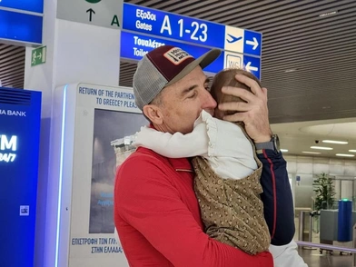 Λίγο πριν επιβιβαστεί στο αεροπλάνο, ο Αντώνης Συκάρης πήρε αγκαλιά την εγγονή του, την Ιριδα, η οποία σήμερα είναι σχεδόν δύο ετών και την κράτησε σφιχτά με το φωτογραφικό στιγμιότυπο να αποτυπώνει την λαχτάρα του να ζήσει τη στιγμή.