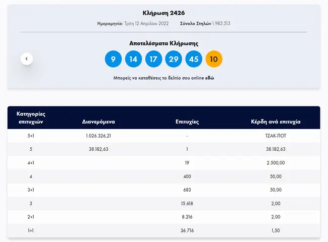 Σήμερα, Τρίτη 12 Απριλίου 2022, στην κλήρωση Τζόκερ (2426) του ΟΠΑΠ, μοιράζεται στους τυχερούς της πρώτης κατηγορίας το ποσό του 1.000.000 ευρώ. Οι τυχεροί αριθμοί στη σημερινή κλήρωση Τζόκερ είναι οι εξής: 9, 14, 17, 29, 45 και Τζόκερ ο αριθμός 10.