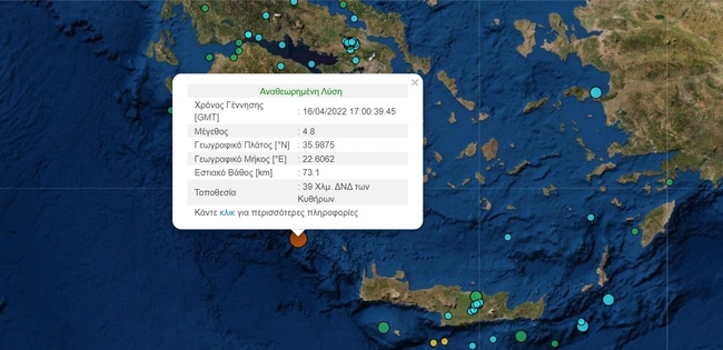 Ισχυρή σεισμική δόνηση της τάξης των 4,8 βαθμών της κλίμακας Ρίχτερ σημειώθηκε στις 20:00, το βράδυ του Σαββάτου, νότια από τα Κύθηρα. Συγκεκριμένα, σύμφωνα με το Γεωδυναμικό Ινστιτούτο, ο σεισμός σημειώθηκε 39 χιλιόμετρα δυτικά, νοτιοδυτικά των Κυθήρων, ενώ είχε εστιακό βάθος 73,1 χιλιόμετρα. Σύμφωνα με την προκαταρκτική λύση επικέντρου, το γεωγραφικό πλάτος είναι 35.9875 βόρεια και το γεωγραφικό μήκος 22.6062 ανατολικά. Νωρίτερα, το Γεωδυναμικό Ινστιτούτο είχε καταγράψει τον σεισμό με ένταση 5 Ρίχτερ.
