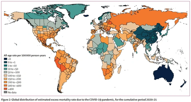 Ενδεικτικός της εικόνας που έχει σχηματιστεί, σε ό,τι αφορά τον δείκτη θνησιμότητας, είναι ο χάρτης που δημοσιεύτηκε από το Lancet και ο οποίος συνοδεύει την πλήρη ανάλυση και δημοσίευση της έρευνας που διεξήχθη. Σε αυτόν τον χάρτη η Ελλάδα είναι ανάμεσα στις χώρες που ναι μεν μετρούν απώλειες από τον κορονοϊό, όχι όμως τόσο αυξημένες όσο σε άλλες χώρες όπου η θνησιμότητα εκτινάχθηκε στα ύψη. Ειδικότερα σε χώρες της Λατινικής Αμερικής, της Ανατολικής και Κεντρικής Ευρώπης, στην Αφρική αλλά και στις ΗΠΑ τα ποσοστά αυξήθηκαν ραγδαία και καταγράφηκαν μερικά από τα υψηλότερα παγκοσμίως.